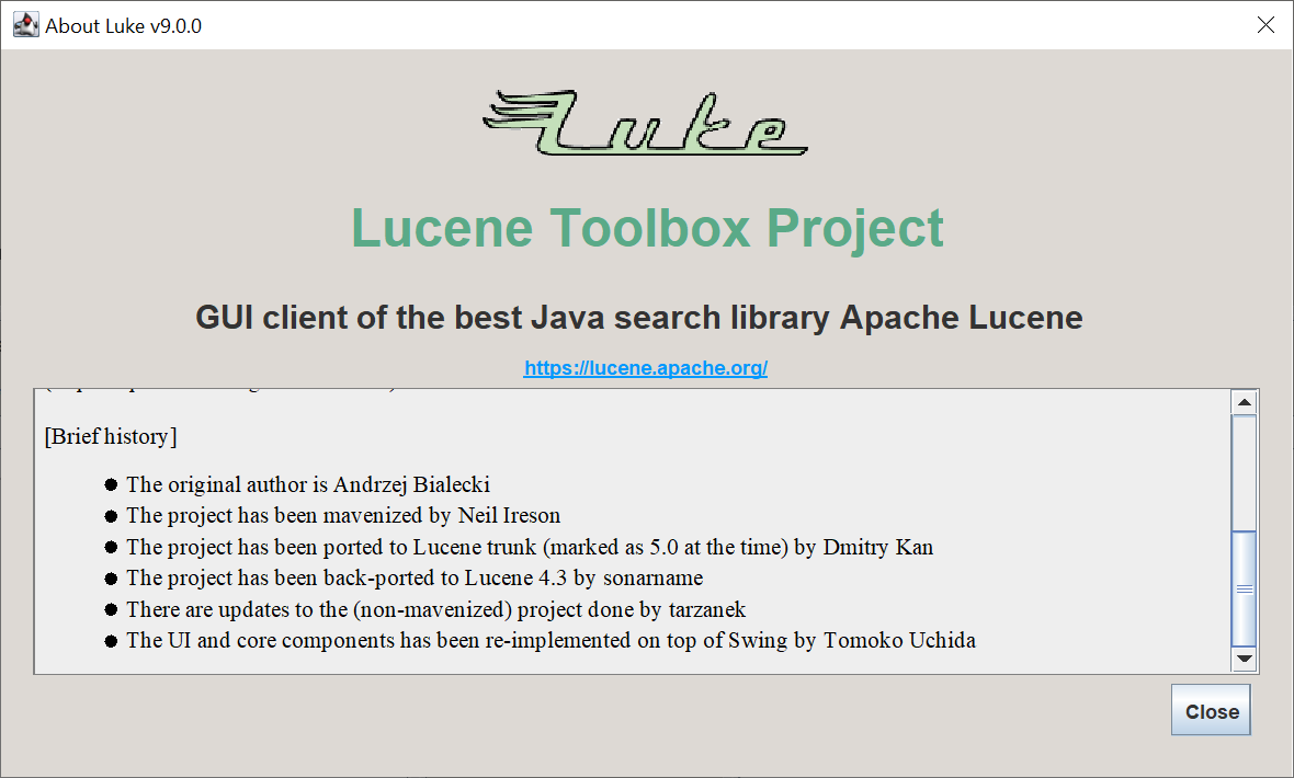uschindler commented on issue #618: #Lucene-2562: Make Luke a Lucene/Solr Module URL: https://github.com/apache/lucene-solr/pull/618#issuecomment-480490996 I noticed, when I open the about box, the text area is by default now scrolled to bottom:  Thanks for all your work, it's really fantastic to get Luke finally into Lucene's Default Download package.
