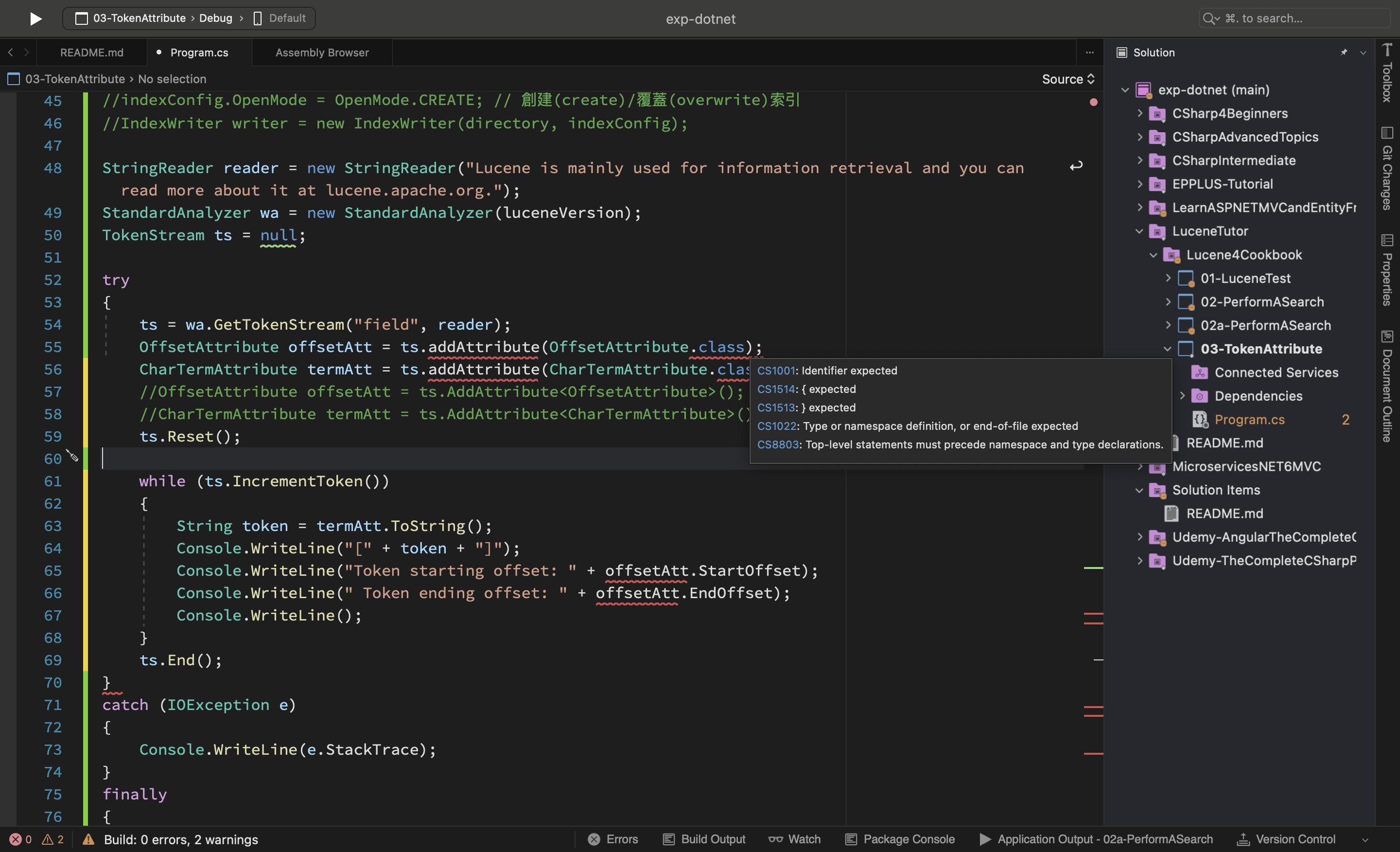 Hi, I am going through the Lucene 4 Cookbook's example. Not sure how to revise the Java version's codes to C# as shown below. original code : Line 55, 56 revised code: Line 57, 58  Any suggestion? Thanks. ```csharp StringReader reader = new StringReader("Lucene is mainly used for information retrieval and you can read more about it at lucene.apache.org."); StandardAnalyzer wa = new StandardAnalyzer(luceneVersion); TokenStream ts = null; try { ts = wa.GetTokenStream("field", reader); OffsetAttribute offsetAtt = ts.addAttribute(OffsetAttribute.class); CharTermAttribute termAtt = ts.addAttribute(CharTermAttribute.class); //var offsetAtt = ts.AddAttributeImpl(typeof(OffsetAttribute)) as OffsetAttribute; //CharTermAttribute termAtt = ts.AddAttribute<CharTermAttribute>(); ts.Reset(); while (ts.IncrementToken()) { String token = termAtt.ToString(); Console.WriteLine("[" + token + "]"); Console.WriteLine("Token starting offset: " + offsetAtt.StartOffset); Console.WriteLine(" Token ending offset: " + offsetAtt.EndOffset); Console.WriteLine(); } ts.End(); } ``` -- This is an automated message from the Apache Git Service. To respond to the message, please log on to GitHub and use the URL above to go to the specific comment. To unsubscribe, e-mail: [email protected] For queries about this service, please contact Infrastructure at: [email protected]