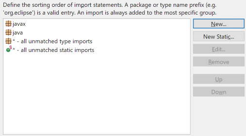 It is possible to match "everything else" by setting `*` as the package, so the same import order can be set up within Eclipse:  -- This is an automated message from the Apache Git Service. To respond to the message, please log on to GitHub and use the URL above to go to the specific comment. To unsubscribe, e-mail: [email protected] For queries about this service, please contact Infrastructure at: [email protected] --------------------------------------------------------------------- To unsubscribe, e-mail: [email protected] For additional commands, e-mail: [email protected]