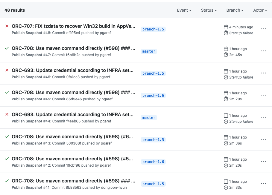 > @pgaref . What is the reason why you do `force-push` on the community `branch-1.5`? > >  Hey @dongjoon-hyun -- tried to clear a dummy commit messaged and caused an accidental force push on 2 more branches as described here: https://github.com/apache/orc/pull/599#issuecomment-753599534 Everything should be recovered by now. ---------------------------------------------------------------- This is an automated message from the Apache Git Service. To respond to the message, please log on to GitHub and use the URL above to go to the specific comment. For queries about this service, please contact Infrastructure at: [email protected]