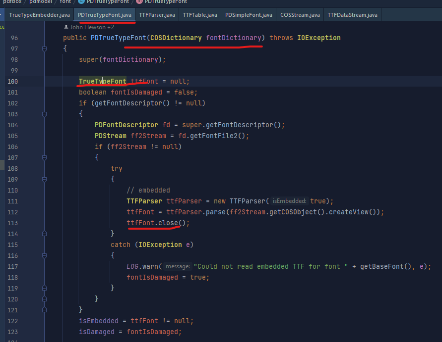 > Re 1: this is a known problem, a comment mentions PDFBOX-4963 Re 2: TTFParser does not have a close method It was ttfFont.  -- This is an automated message from the Apache Git Service. To respond to the message, please log on to GitHub and use the URL above to go to the specific comment. To unsubscribe, e-mail: [email protected] For queries about this service, please contact Infrastructure at: [email protected] --------------------------------------------------------------------- To unsubscribe, e-mail: [email protected] For additional commands, e-mail: [email protected]