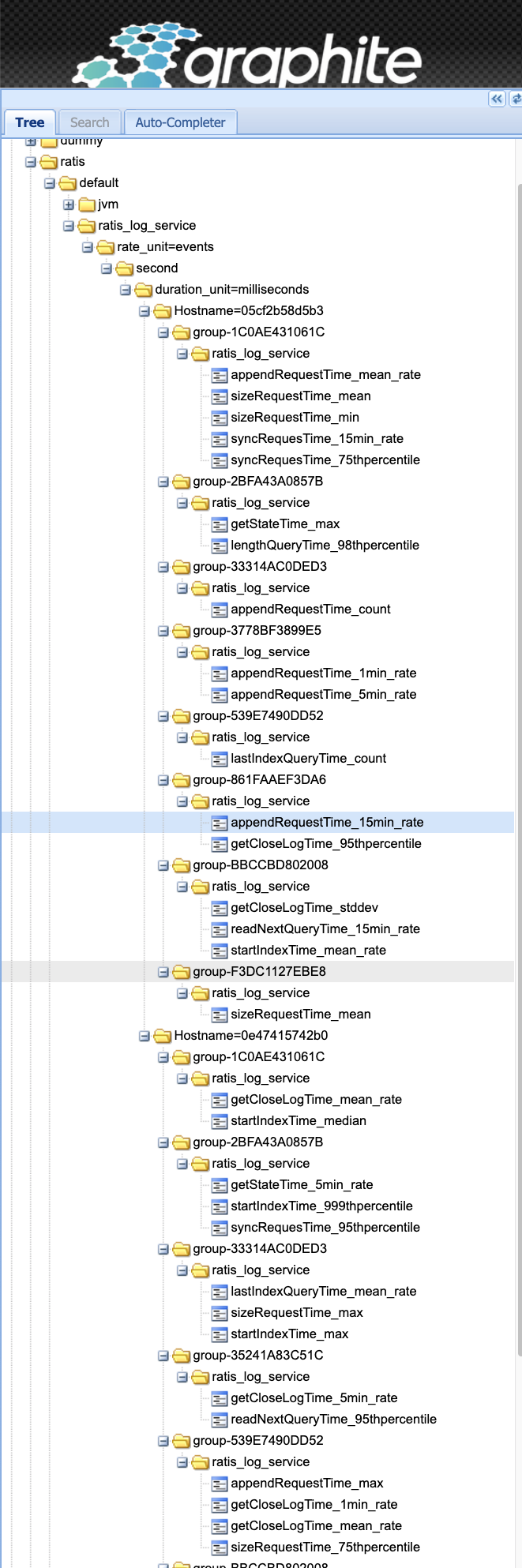 joshelser commented on issue #26: RATIS-594 RATIS-593 RATIS-551 Add HadoopMetrics2Adaptor for dropwizard metrics and Graphite container for log service URL: https://github.com/apache/incubator-ratis/pull/26#issuecomment-505652565 Can confirm that the graphite wiring up works!  One thing that looks curious is that we only ever have one metric per raft group. I would expect to see the full set of metrics for every group. This makes me think that something is de-duplicating them based on the final component of the metric name. For example, instead of having sizeRequestTime_min for every "group_*", we only have one instance in "group_1C0AE431061C". I'm not sure if this is a bug in the Ratis metrics work or in the Reporter.