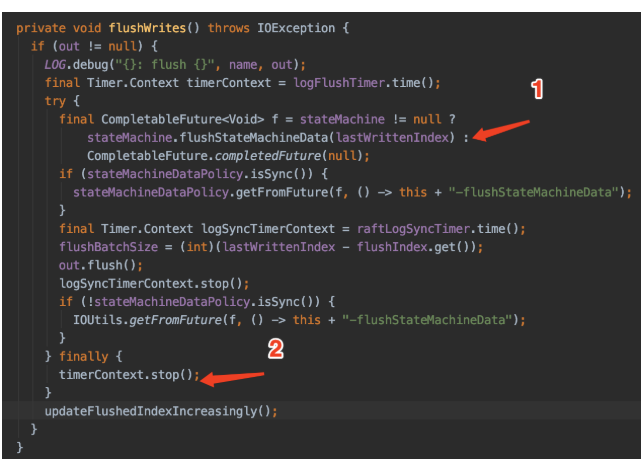 @lokeshj1703 It can not be fixed by RATIS-881, it was caused by UT and Ratis Use different threads, and can not reproduce every time. And I test it again, it still happen. To easy reproduce, you can add Thead.sleep(1000) between statement 1 and statement 2 to delay the timerContext.stop(), it will happen.  ---------------------------------------------------------------- This is an automated message from the Apache Git Service. To respond to the message, please log on to GitHub and use the URL above to go to the specific comment. For queries about this service, please contact Infrastructure at: [email protected]