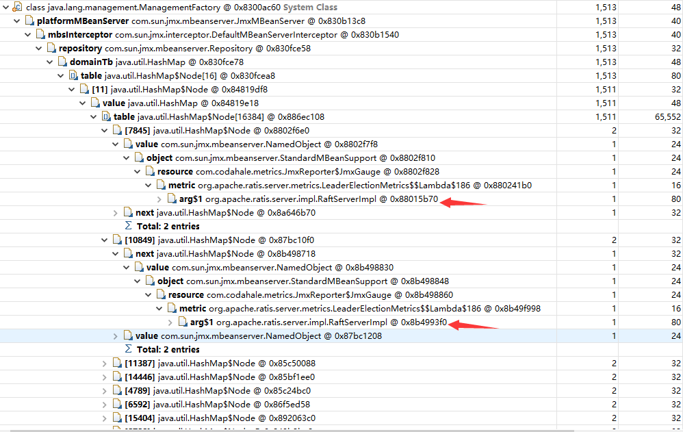 ManagermentFactory->jxmMBeanServer->HashMap, 372 RaftServerImpl were held by