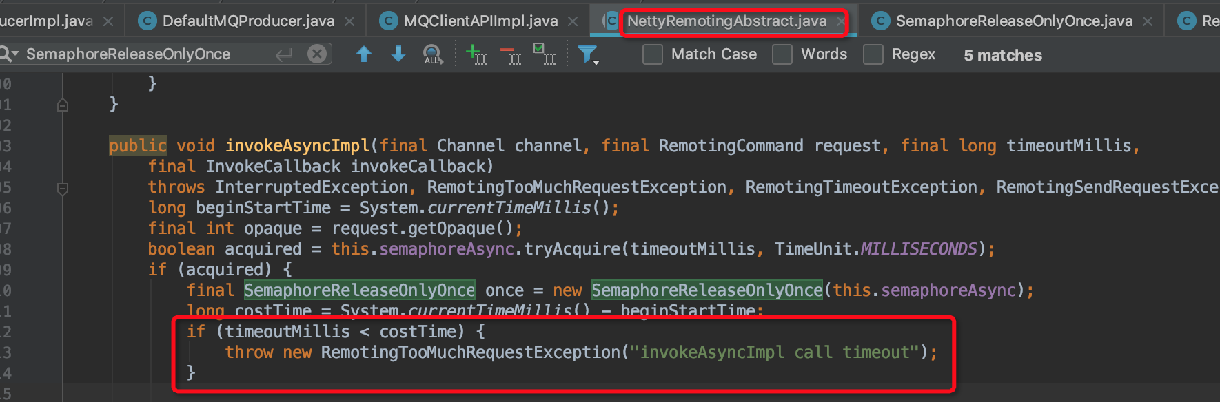ymwneu opened a new issue #604: NettyRemotingAbstract#invokeAsyncImpl will not release semaphore if invoke timeout. URL: https://github.com/apache/rocketmq/issues/604 **BUG REPORT** 1. Please describe the issue you observed: - What did you do (The steps to reproduce)?  If NettyRemotingAbstract#invokeAsyncImpl invoke timeout, the semaphoreAsync will not be released. In extreme case, it will occupy all semaphore and cause all asynchronous request send failed. - What did you expect to see? Semaphore be released if timeout. - What did you see instead? Semaphore not be released, if timeout. 2. Please tell us about your environment: From RocketMQ 4.3.0 to current version. 3. Other information (e.g. detailed explanation, logs, related issues, suggestions how to fix, etc):