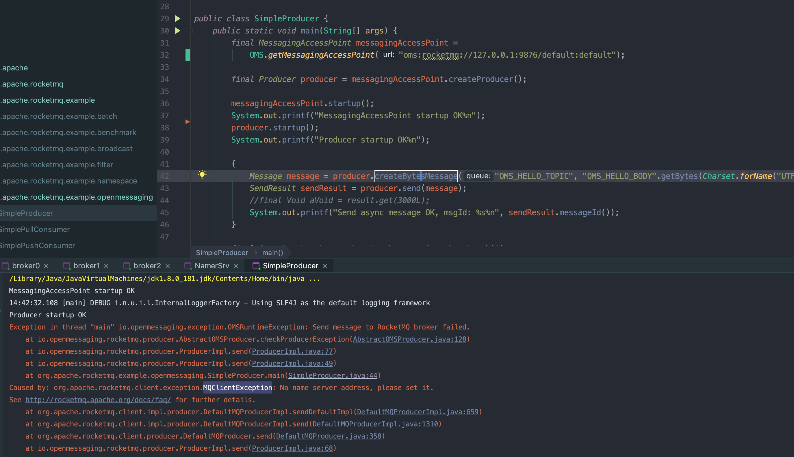 Liberxue opened a new issue #1272: exampleopenmessaging MQClientException No name server address, please set it. URL: https://github.com/apache/rocketmq/issues/1272 The issue tracker is **ONLY** used for bug report(feature request need to follow [RIP process](https://github.com/apache/rocketmq/wiki/RocketMQ-Improvement-Proposal)). Keep in mind, please check whether there is an existing same report before your raise a new one. Alternately (especially if your communication is not a bug report), you can send mail to our [mailing lists](http://rocketmq.apache.org/about/contact/). We welcome any friendly suggestions, bug fixes, collaboration and other improvements. Please ensure that your bug report is clear and that it is complete. Otherwise, we may be unable to understand it or to reproduce it, either of which would prevent us from fixing the bug. We strongly recommend the report(bug report or feature request) could include some hints as the following: **BUG REPORT** 1. Please describe the issue you observed: - What did you do (The steps to reproduce)?  - What did you expect to see? - What did you see instead? 2. Please tell us about your environment: 3. Other information (e.g. detailed explanation, logs, related issues, suggestions how to fix, etc): **FEATURE REQUEST** 1. Please describe the feature you are requesting. 2. Provide any additional detail on your proposed use case for this feature. 2. Indicate the importance of this issue to you (blocker, must-have, should-have, nice-to-have). Are you currently using any workarounds to address this issue? 4. If there are some sub-tasks using -[] for each subtask and create a corresponding issue to map to the sub task: - [sub-task1-issue-number](example_sub_issue1_link_here): sub-task1 description here, - [sub-task2-issue-number](example_sub_issue2_link_here): sub-task2 description here, - ...