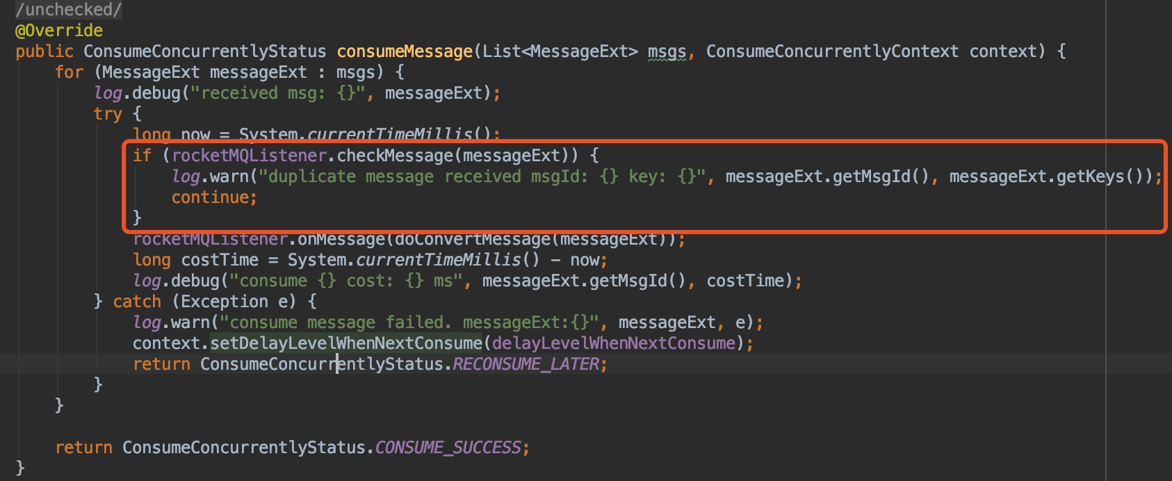 dongdongzld commented on issue #122: how to make the consumer idempotency URL: https://github.com/apache/rocketmq-spring/issues/122#issuecomment-522571102