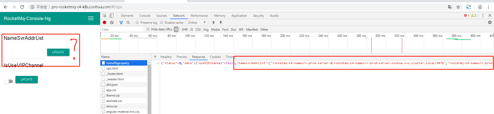 hepyu opened a new issue #409: No namesrvAdd was showed in the browse after I put rocketmq-console into k8s URL: https://github.com/apache/rocketmq-externals/issues/409 There some wired phenomenon after I put rocketmq-console into k8s as below: No namesrvAdd was showed in the browse, but async http response workd and get response about namesrvAdd message,is there some js bug ?