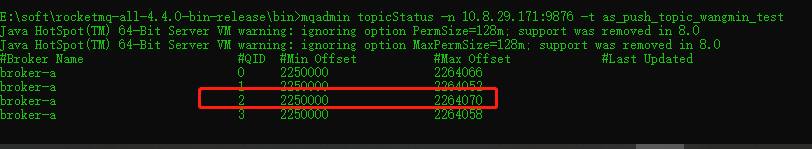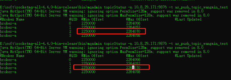 antianchi opened a new issue #1613: 发送消息返回的Offset与用mqadmin查询的偏移量对不牢 URL: https://github.com/apache/rocketmq/issues/1613 我有一个topic,我发送消息都可以,但是无法消费。 为了找到问题,我进行了以下操作: - 发送消息 可以看到,发送的队列2,且队列偏移量为3016377。  - 使用mqadmin查询队列状态,响应如下  发现,明显两边,对不起来,再次发送消息,查询状态,发现依然不变。  真不知道这个是什么原因了。。。