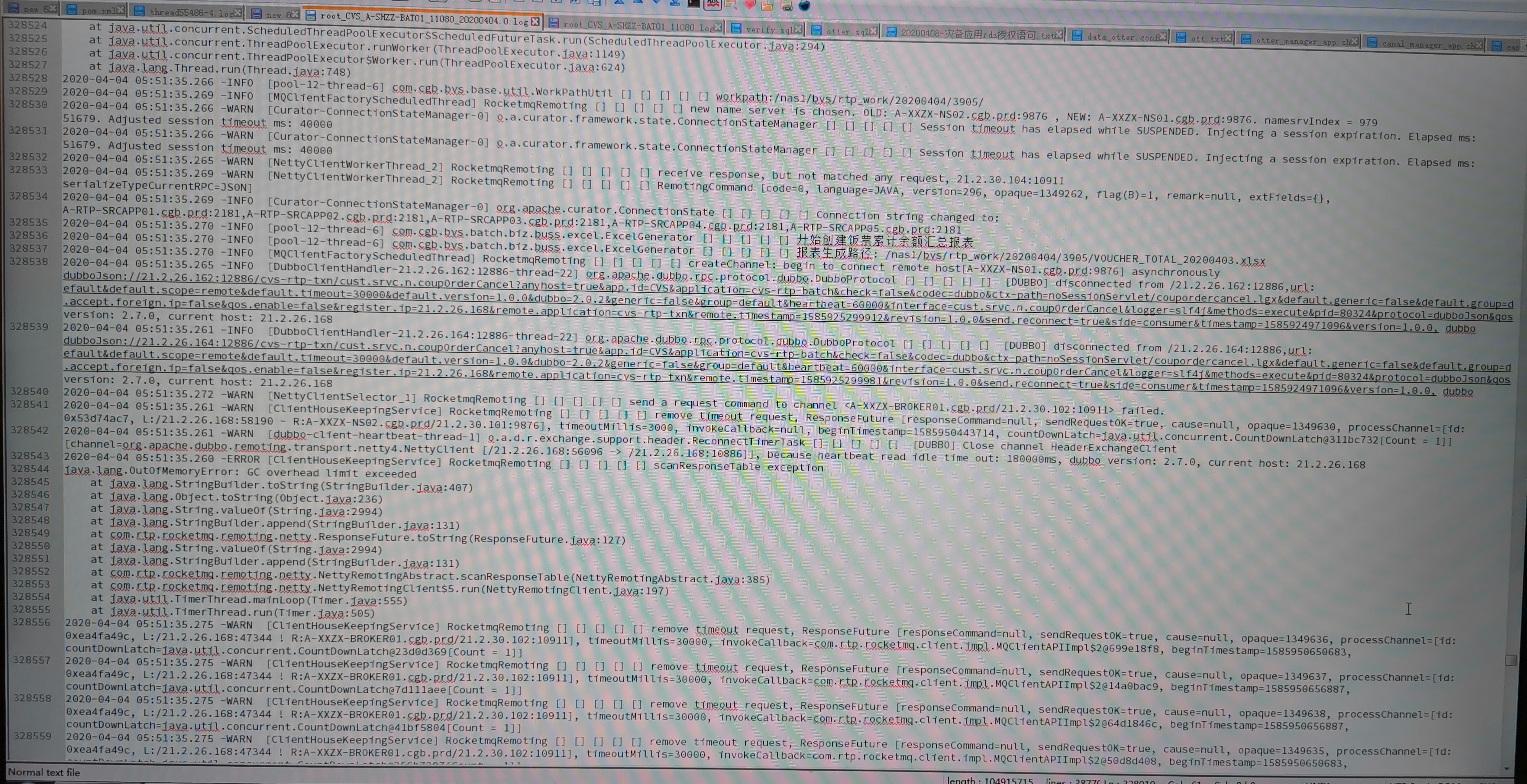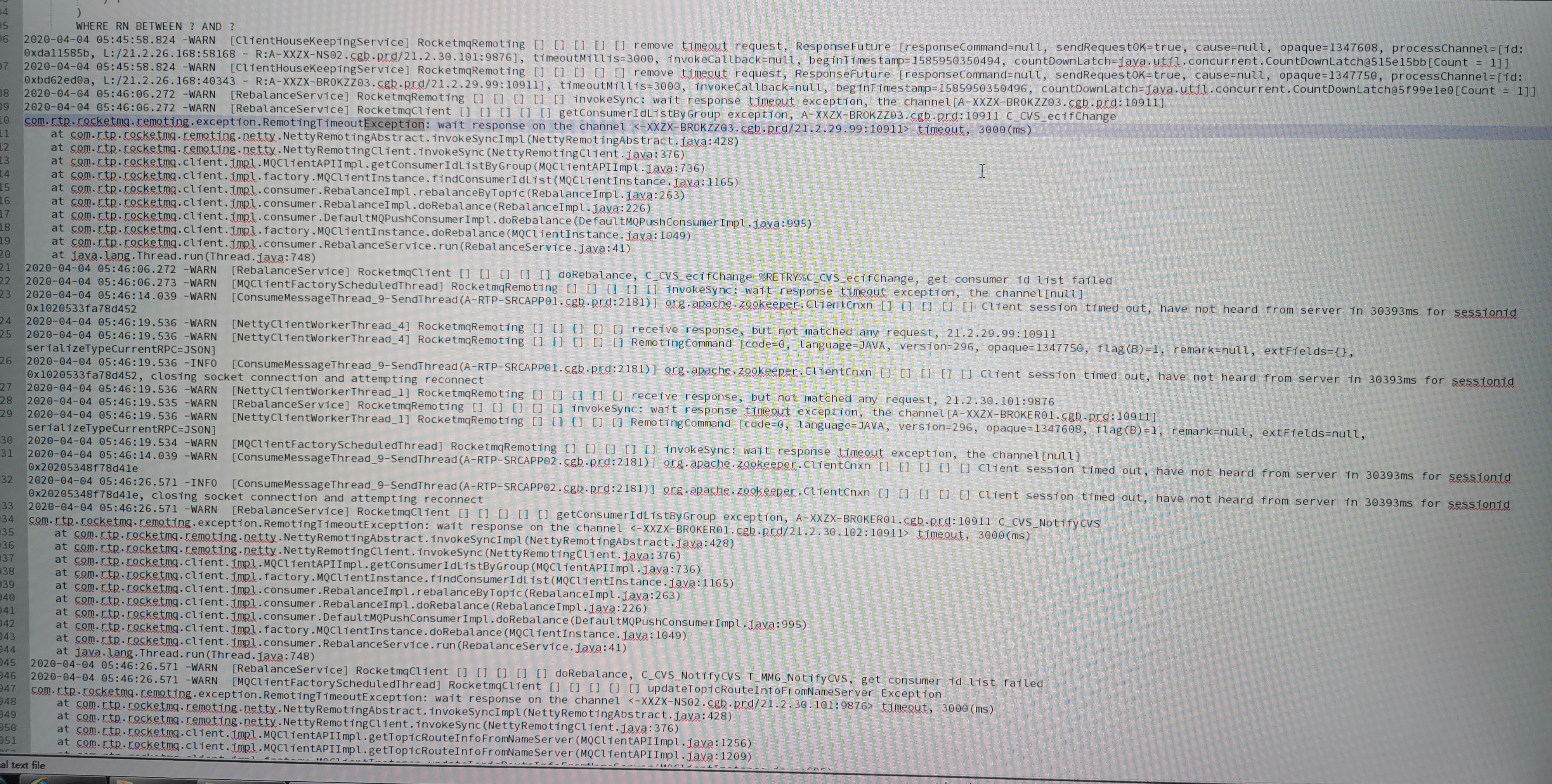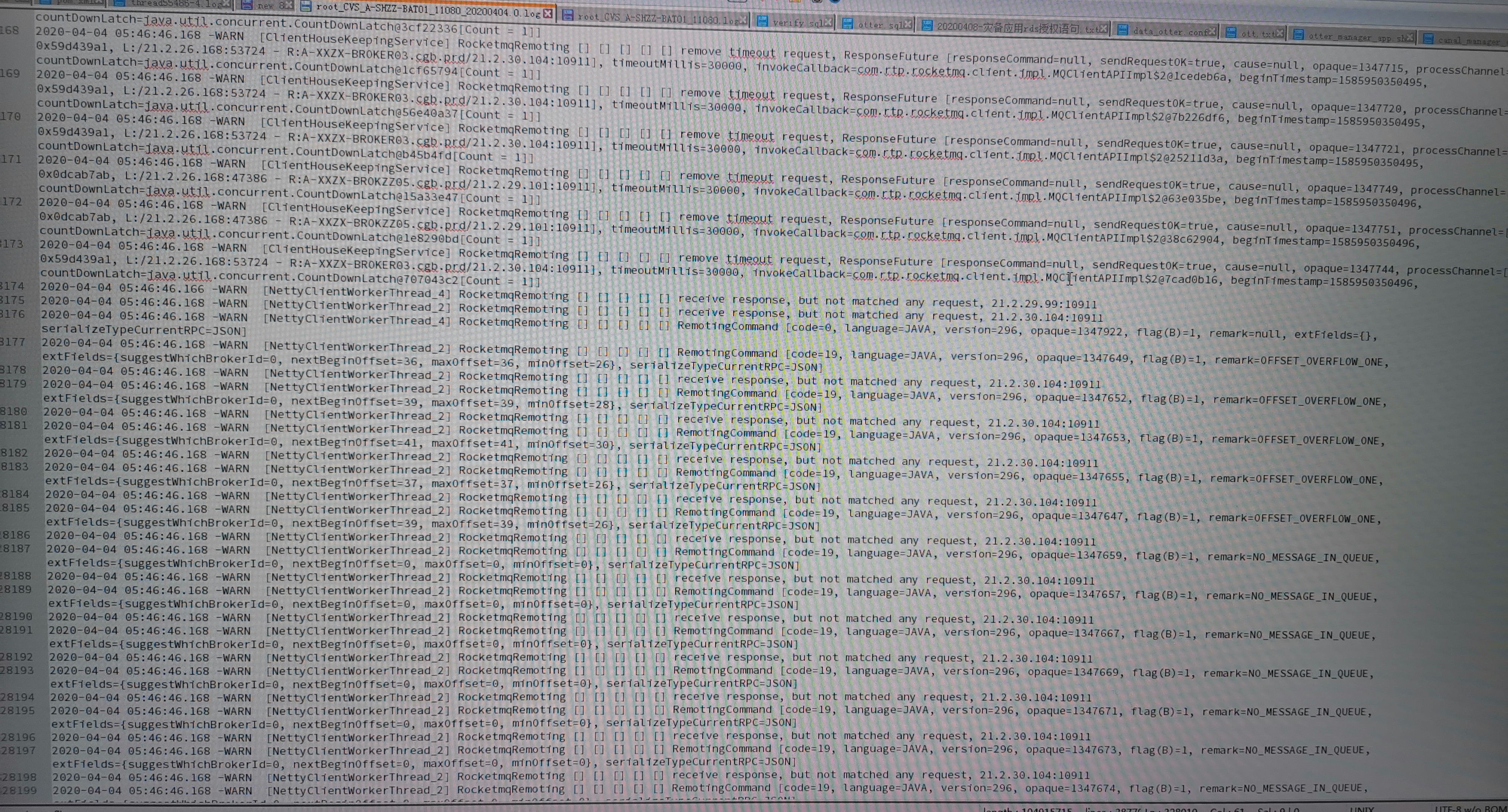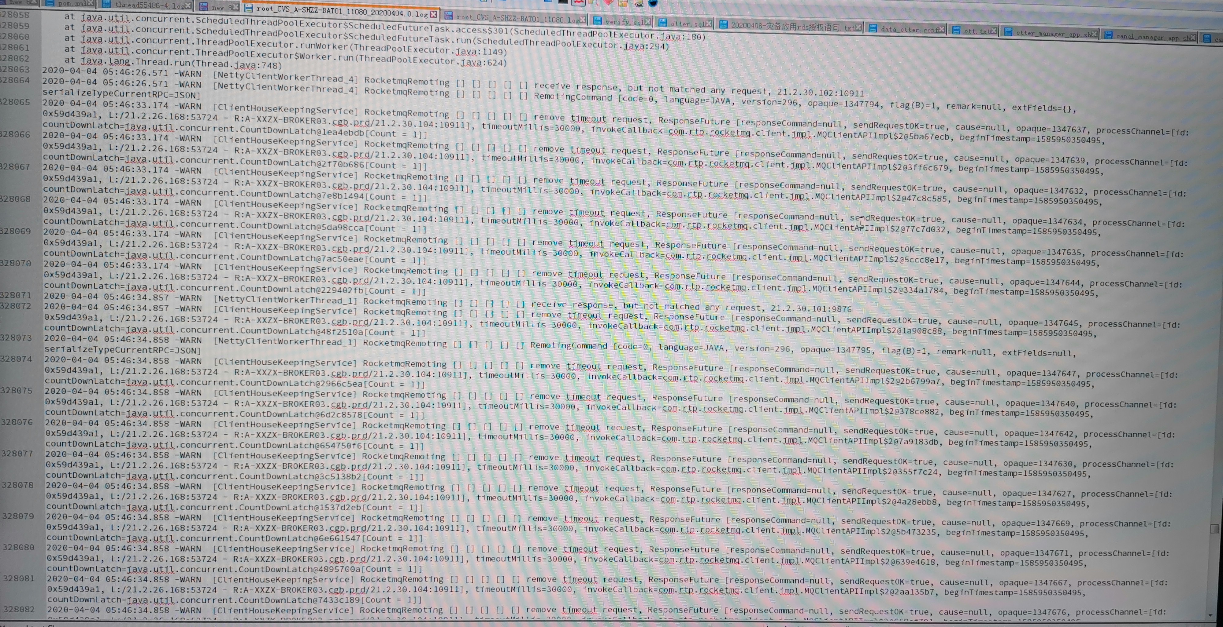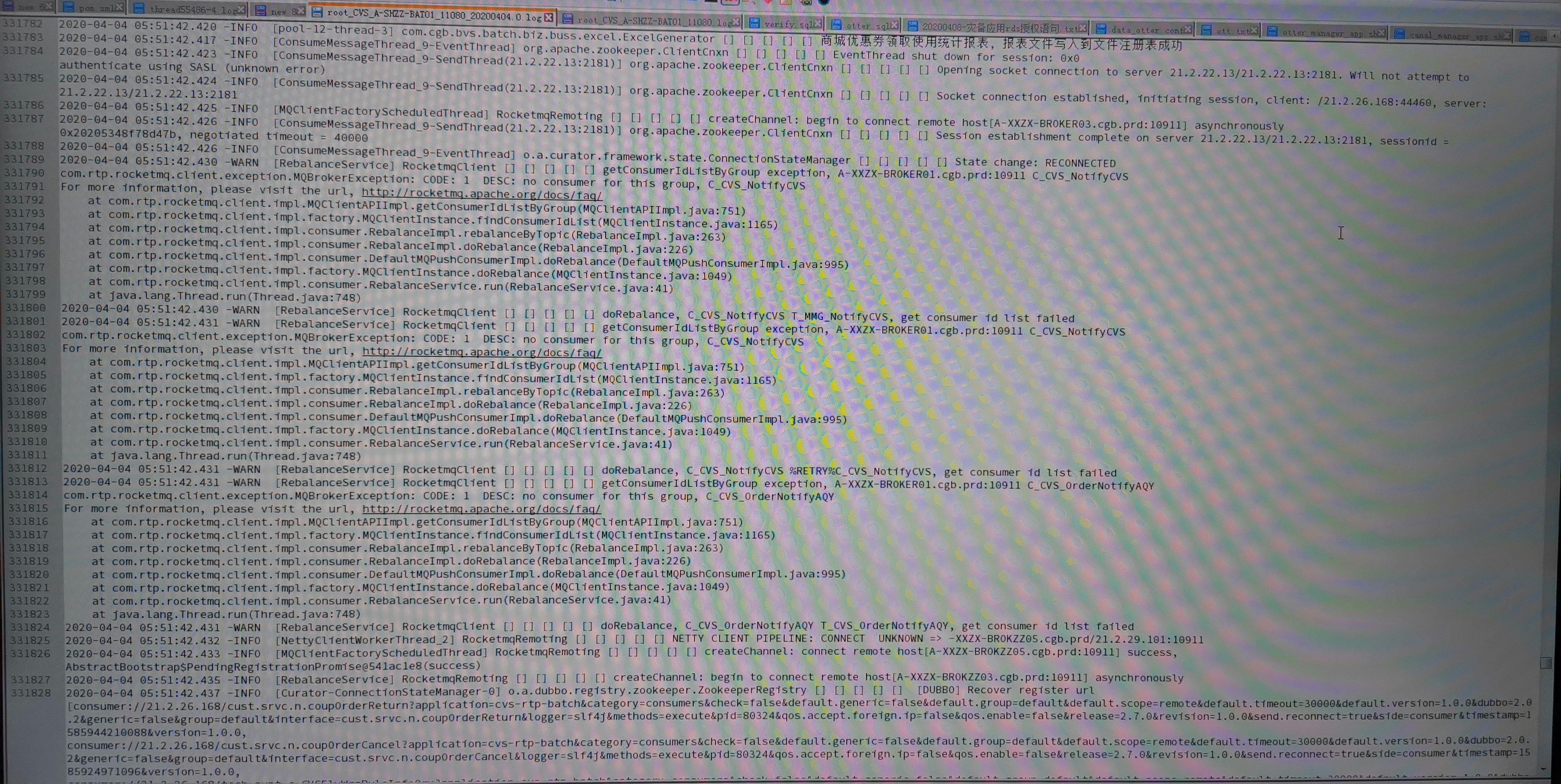 xiaoyuzxcasd commented on issue #1918: About consumers stopping pulling messages URL: https://github.com/apache/rocketmq/issues/1918#issuecomment-611903801 > @xiaoyuzxcasd ping First of all, thank you for your attention to this issue. Due to the restrictions of the company's system, I cannot take out the complete log file from the company's computer and send it to you. The only way to show you is to take a photo to capture the key part. But I think the most critical logs have been intercepted before, and I don't know what else to offer. The following is the log from the network failure to the network recovery, I hope it can give you some discovery: