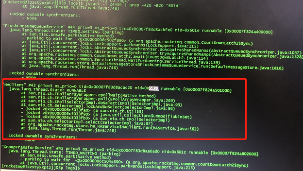 The issue tracker is **ONLY** used for bug report(feature request need to follow [RIP process](https://github.com/apache/rocketmq/wiki/RocketMQ-Improvement-Proposal)). Keep in mind, please check whether there is an existing same report before your raise a new one. Alternately (especially if your communication is not a bug report), you can send mail to our [mailing lists](http://rocketmq.apache.org/about/contact/). We welcome any friendly suggestions, bug fixes, collaboration and other improvements. Please ensure that your bug report is clear and that it is complete. Otherwise, we may be unable to understand it or to reproduce it, either of which would prevent us from fixing the bug. We strongly recommend the report(bug report or feature request) could include some hints as the following: **BUG REPORT** 1. Please describe the issue you observed: 两主两从部署,异步刷盘,同步双写,业务进行时client发生请求超时,经排查从节点不可用了,有一线程吃掉一CPU,即HAClient,并导致主从同步不可用。  top -Hp 24494  printf "%x\n" 24605   2. Please tell us about your environment: jdk: 1.8.0_251 linux kernel: 3.10.0-957.e17.x86_64 rocket version: 4.7.0 3. Other information (e.g. detailed explanation, logs, related issues, suggestions how to fix, etc): JDK-2147719 : (se) Selector doesn't block on Selector.select(timeout) (lnx) https://bugs.java.com/bugdatabase/view_bug.do?bug_id=2147719 https://bugs.java.com/bugdatabase/view_bug.do?bug_id=8186337 ---------------------------------------------------------------- This is an automated message from the Apache Git Service. To respond to the message, please log on to GitHub and use the URL above to go to the specific comment. For queries about this service, please contact Infrastructure at: [email protected]