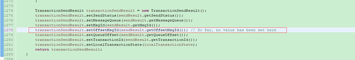 The issue tracker is **ONLY** used for bug report(feature request need to follow [RIP process](https://github.com/apache/rocketmq/wiki/RocketMQ-Improvement-Proposal)). Keep in mind, please check whether there is an existing same report before your raise a new one. Alternately (especially if your communication is not a bug report), you can send mail to our [mailing lists](http://rocketmq.apache.org/about/contact/). We welcome any friendly suggestions, bug fixes, collaboration and other improvements. Please ensure that your bug report is clear and that it is complete. Otherwise, we may be unable to understand it or to reproduce it, either of which would prevent us from fixing the bug. We strongly recommend the report(bug report or feature request) could include some hints as the following: **BUG REPORT** 1. `TransactionSendResult.offsetMsgId` doesn't be seted in method `org.apache.rocketmq.client.impl.producer.DefaultMQProducerImpl.sendMessageInTransaction(Message, LocalTransactionExecuter, Object)` 2. when i use the `TransactionSendResult` to call `org.apache.rocketmq.client.impl.producer.DefaultMQProducerImpl.endTransaction(SendResult, LocalTransactionState, Throwable)` i got an exception, like this ``` java java.lang.IllegalArgumentException: port out of range:1393301684 at java.net.InetSocketAddress.checkPort(InetSocketAddress.java:143) at java.net.InetSocketAddress.<init>(InetSocketAddress.java:188) at org.apache.rocketmq.common.message.MessageDecoder.decodeMessageId(MessageDecoder.java:87) at org.apache.rocketmq.client.impl.producer.DefaultMQProducerImpl.endTransaction(DefaultMQProducerImpl.java:1236) at com.qiuxs.boot.demo.mq.ProducerUtils.endTransaction(ProducerUtils.java:58) at com.qiuxs.boot.demo.mq.ProducerUtils.commit(ProducerUtils.java:46) at com.qiuxs.boot.demo.service.TxService$1.afterCompletion(TxService.java:21) at org.springframework.transaction.support.TransactionSynchronizationUtils.invokeAfterCompletion(TransactionSynchronizationUtils.java:171) at org.springframework.transaction.support.AbstractPlatformTransactionManager.invokeAfterCompletion(AbstractPlatformTransactionManager.java:989) at org.springframework.transaction.support.AbstractPlatformTransactionManager.triggerAfterCompletion(AbstractPlatformTransactionManager.java:964) at org.springframework.transaction.support.AbstractPlatformTransactionManager.processCommit(AbstractPlatformTransactionManager.java:785) at org.springframework.transaction.support.AbstractPlatformTransactionManager.commit(AbstractPlatformTransactionManager.java:711) at org.springframework.transaction.interceptor.TransactionAspectSupport.commitTransactionAfterReturning(TransactionAspectSupport.java:633) at org.springframework.transaction.interceptor.TransactionAspectSupport.invokeWithinTransaction(TransactionAspectSupport.java:386) at org.springframework.transaction.interceptor.TransactionInterceptor.invoke(TransactionInterceptor.java:118) at org.springframework.aop.framework.ReflectiveMethodInvocation.proceed(ReflectiveMethodInvocation.java:186) at org.springframework.aop.framework.CglibAopProxy$CglibMethodInvocation.proceed(CglibAopProxy.java:749) at org.springframework.aop.framework.CglibAopProxy$DynamicAdvisedInterceptor.intercept(CglibAopProxy.java:691) at com.qiuxs.boot.demo.service.TxService$$EnhancerBySpringCGLIB$$4f492874.doInTx(<generated>) at com.qiuxs.boot.demo.ctrl.MqController.send(MqController.java:20) at sun.reflect.NativeMethodAccessorImpl.invoke0(Native Method) at sun.reflect.NativeMethodAccessorImpl.invoke(NativeMethodAccessorImpl.java:62) at sun.reflect.DelegatingMethodAccessorImpl.invoke(DelegatingMethodAccessorImpl.java:43) at java.lang.reflect.Method.invoke(Method.java:498) ```  ---------------------------------------------------------------- This is an automated message from the Apache Git Service. To respond to the message, please log on to GitHub and use the URL above to go to the specific comment. For queries about this service, please contact Infrastructure at: [email protected]