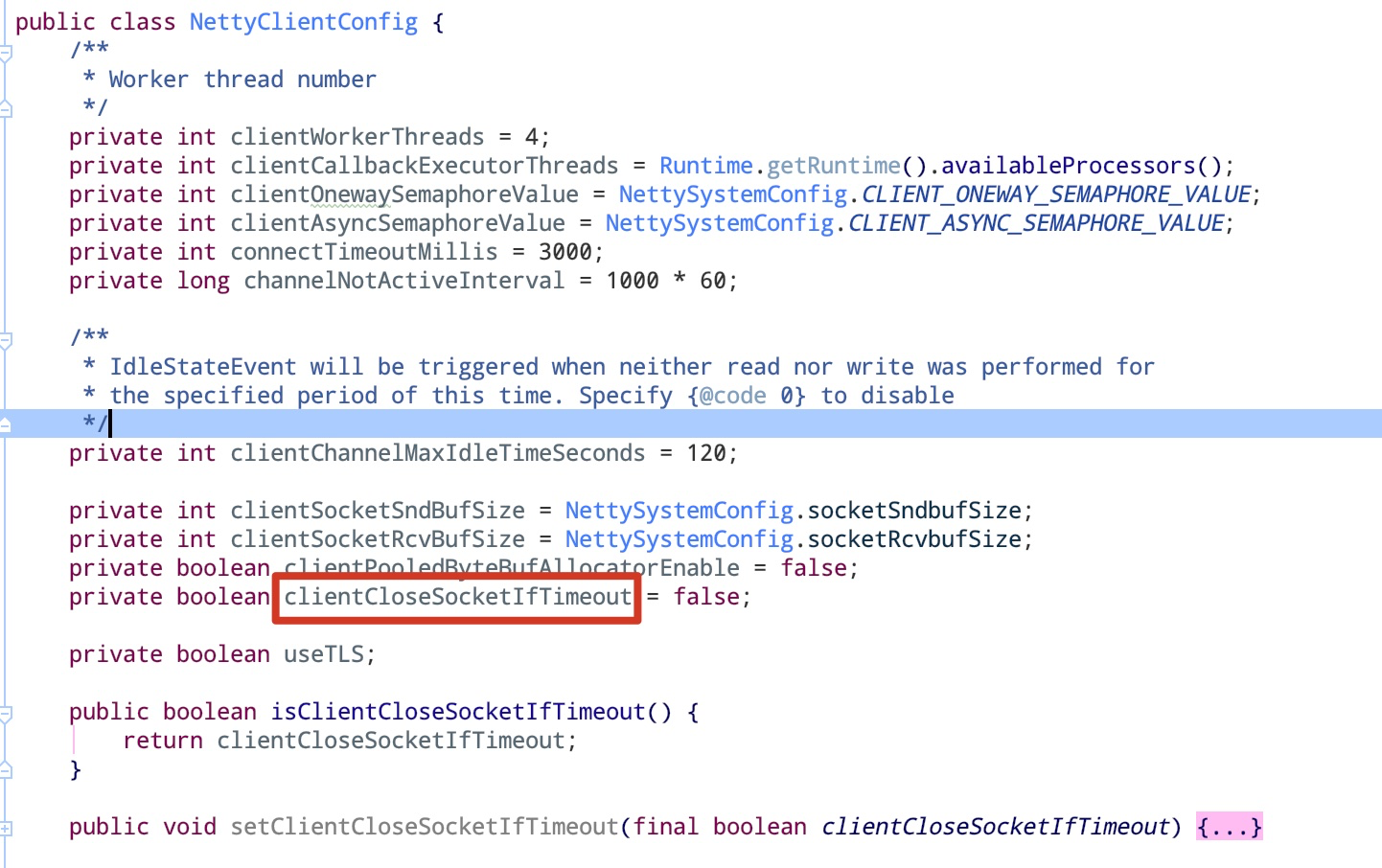 NettyClientConfig has a property `clientCloseSocketIfTimeout ` to set whether to close socket if invoke timeout, but no where to use and can not be configured from Producer or Consumer api.  **FEATURE REQUEST** 1. Please describe the feature you are requesting. clientCloseSocketIfTimeout property can be set from ClientConfig 2. Indicate the importance of this issue to you (blocker, must-have, should-have, nice-to-have). Are you currently using any workarounds to address this issue? should-have ---------------------------------------------------------------- This is an automated message from the Apache Git Service. To respond to the message, please log on to GitHub and use the URL above to go to the specific comment. For queries about this service, please contact Infrastructure at: [email protected]