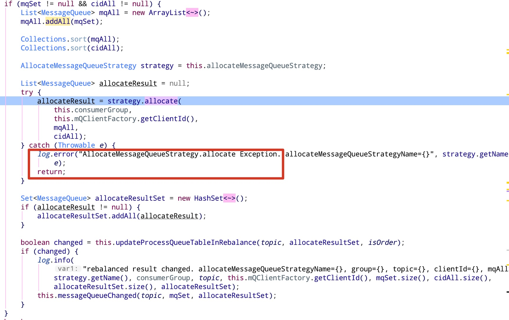 **BUG REPORT** 1. Please describe the issue you observed: consumer is subscribing a topic, when modify topic permission to not readable or just delete this topic, we hope to see the consumer will not dispatch pull request to broker , but actually pull request will always ongoing with a exception except restart the consumer. the exception stack trace is like this: `2021-04-02 15:24:54.018 WARN [NettyClientPublicExecutor_2:RocketmqClient:130] execute the pull request exception org.apache.rocketmq.client.exception.MQBrokerException: CODE: 17 DESC: topic[topic-flash2] not exist, apply first please! See http://rocketmq.apache.org/docs/faq/ for further details. BROKER: 192.168.60.39:10911 at org.apache.rocketmq.client.impl.MQClientAPIImpl.processPullResponse(MQClientAPIImpl.java:794) ~[rocketmq-client-4.8.0.jar:4.8.0] at org.apache.rocketmq.client.impl.MQClientAPIImpl.access$200(MQClientAPIImpl.java:167) ~[rocketmq-client-4.8.0.jar:4.8.0] at org.apache.rocketmq.client.impl.MQClientAPIImpl$2.operationComplete(MQClientAPIImpl.java:745) [rocketmq-client-4.8.0.jar:4.8.0] at org.apache.rocketmq.remoting.netty.ResponseFuture.executeInvokeCallback(ResponseFuture.java:54) [rocketmq-remoting-4.8.0.jar:4.8.0] at org.apache.rocketmq.remoting.netty.NettyRemotingAbstract$2.run(NettyRemotingAbstract.java:319) [rocketmq-remoting-4.8.0.jar:4.8.0] at java.util.concurrent.Executors$RunnableAdapter.call(Executors.java:511) [?:1.8.0_211] at java.util.concurrent.FutureTask.run$$$capture(FutureTask.java:266) [?:1.8.0_211] at java.util.concurrent.FutureTask.run(FutureTask.java) [?:1.8.0_211] at java.util.concurrent.ThreadPoolExecutor.runWorker(ThreadPoolExecutor.java:1149) [?:1.8.0_211] at java.util.concurrent.ThreadPoolExecutor$Worker.run(ThreadPoolExecutor.java:624) [?:1.8.0_211] at java.lang.Thread.run(Thread.java:748) [?:1.8.0_211]` as the code show below, when there is no queue left for a topic , a exception will throw from AllocateStrategy, then processQueueTable will not be updated  2. Please tell us about your environment: rocketmq 4.8.0 -- This is an automated message from the Apache Git Service. To respond to the message, please log on to GitHub and use the URL above to go to the specific comment. For queries about this service, please contact Infrastructure at: [email protected]
