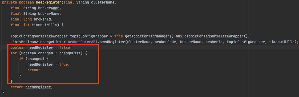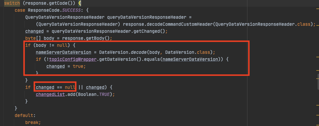 two problems: (1)when broker receives namesrv's response, there is no need to decode the body of the response (2) in the reponse that the namesrv returns, changed will not be null, it's true or false  Since the changedList only obatain the value of Boolean.TRUE, so we only judge whether the size of changedList is greater than 0 instead of loop the list  -- This is an automated message from the Apache Git Service. To respond to the message, please log on to GitHub and use the URL above to go to the specific comment. For queries about this service, please contact Infrastructure at: [email protected]