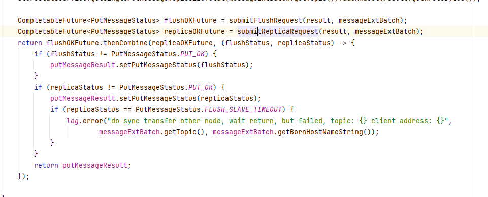 >  > org.apache.rocketmq.store.CommitLog#asyncPutMessages > I did not find the code you said First is here, org/apache/rocketmq/store/CommitLog#putMessage, It could be seen that the message appending operation in point A(I annotated in the following code), and the disk flushing operation and ha waiting operation in point B. However, the reputMessageService (org.apache.rocketmq.store.DefaultMessageStore.ReputMessageService), which did the reput service (get the message from commitLog and put it into consumerQueue) in another thread. I mean if this service is fast enough, some of the message appended after pointA may already been pushed to the consumerQueue, which could be seen by the consumer. However, those messages may have not flushed or replicated to slaves. If something broke there, could that be possible the message is consumed but not recored in the broker? ``` public PutMessageResult putMessage(final MessageExtBrokerInner msg) { //............. **//The following do the appendmessage operation with the mappedfile (point A)** MappedFile unlockMappedFile = null; MappedFile mappedFile = this.mappedFileQueue.getLastMappedFile(); putMessageLock.lock(); //spin or ReentrantLock ,depending on store config try { long beginLockTimestamp = this.defaultMessageStore.getSystemClock().now(); this.beginTimeInLock = beginLockTimestamp; // Here settings are stored timestamp, in order to ensure an orderly // global msg.setStoreTimestamp(beginLockTimestamp); if (null == mappedFile || mappedFile.isFull()) { mappedFile = this.mappedFileQueue.getLastMappedFile(0); // Mark: NewFile may be cause noise } if (null == mappedFile) { log.error("create mapped file1 error, topic: " + msg.getTopic() + " clientAddr: " + msg.getBornHostString()); beginTimeInLock = 0; return new PutMessageResult(PutMessageStatus.CREATE_MAPEDFILE_FAILED, null); } result = mappedFile.appendMessage(msg, this.appendMessageCallback); .............. if (elapsedTimeInLock > 500) { log.warn("[NOTIFYME]putMessage in lock cost time(ms)={}, bodyLength={} AppendMessageResult={}", elapsedTimeInLock, msg.getBody().length, result); } if (null != unlockMappedFile && this.defaultMessageStore.getMessageStoreConfig().isWarmMapedFileEnable()) { this.defaultMessageStore.unlockMappedFile(unlockMappedFile); } PutMessageResult putMessageResult = new PutMessageResult(PutMessageStatus.PUT_OK, result); // Statistics storeStatsService.getSinglePutMessageTopicTimesTotal(msg.getTopic()).incrementAndGet(); storeStatsService.getSinglePutMessageTopicSizeTotal(topic).addAndGet(result.getWroteBytes()); **//Here it actually do the disk flush and ha handling and waiting (pointB)** handleDiskFlush(result, putMessageResult, msg); handleHA(result, putMessageResult, msg); return putMessageResult; } ``` -- This is an automated message from the Apache Git Service. To respond to the message, please log on to GitHub and use the URL above to go to the specific comment. For queries about this service, please contact Infrastructure at: [email protected]