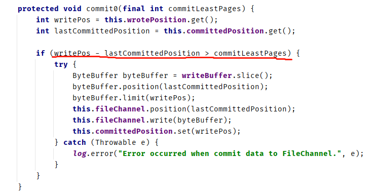 I think the jedgment '**writePos - lastCommittedPosition > commitLeastPages**' in the method 'commit0' of class 'MappedFile' is meaningless in the version 4.8.0.  As you can see. 'writePos - lastCommittedPosition' represents the amount of data that has not been committed, it's in byte. but commitLeastPages represents the least pages(OS_PAGE) should be committed. 'commitLeastPages ' has been determined in method ‘isAbleToCommit’ whether it meets the condition. so '**writePos - lastCommittedPosition > commitLeastPages**' is meaningless, although this expression does not cause errors. I think this expression should be 'writePos - lastCommittedPosition > 0', it used to determine whether there is uncommitted data. Do you think so? -- This is an automated message from the Apache Git Service. To respond to the message, please log on to GitHub and use the URL above to go to the specific comment. To unsubscribe, e-mail: [email protected] For queries about this service, please contact Infrastructure at: [email protected]