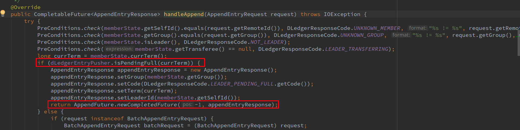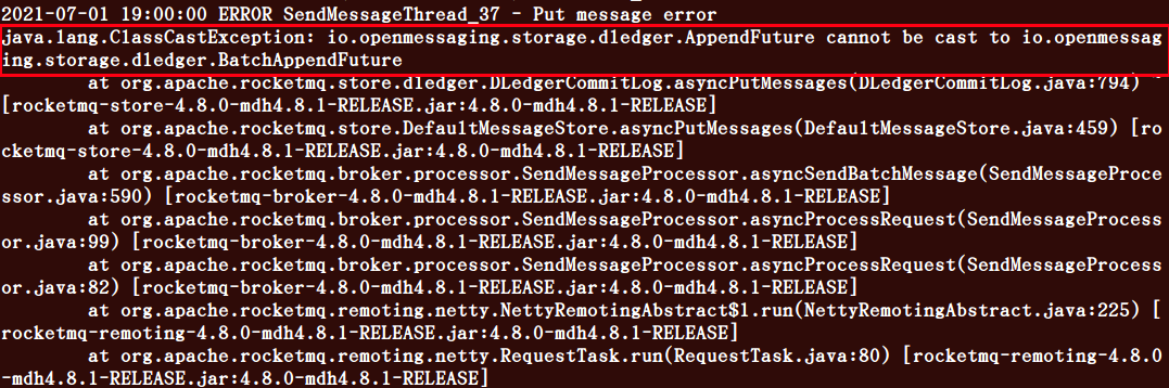 1. Please describe the issue you observed: - When the request of the synchronization copy is pending full, the returned AppendFuture is forced to be converted to BatchAppendFuture, resulting in a type conversion exception.    2. Please tell us about your environment: Linux version 3.10.0 RocketMQ version 4.8 3. Other information (e.g. detailed explanation, logs, related issues, suggestions how to fix, etc): - First judge whether pendingFull is triggered, and then turn to BatchAppendFuture when append is normal -- This is an automated message from the Apache Git Service. To respond to the message, please log on to GitHub and use the URL above to go to the specific comment. To unsubscribe, e-mail: [email protected] For queries about this service, please contact Infrastructure at: [email protected]