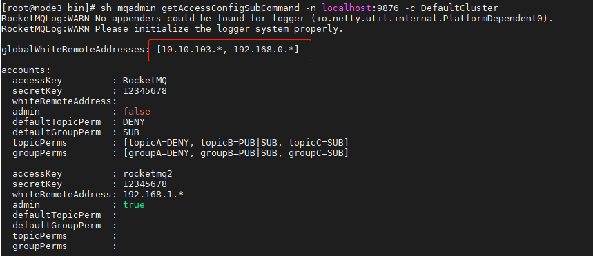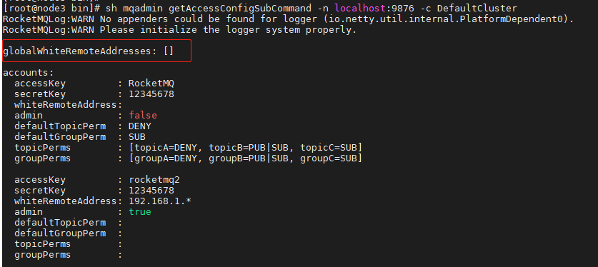 1、Using getAccessConfigSubCommand command to get the ACL configuration information  2、Using updateGlobalWhiteAddr commands or DefaultMQAdminExt# updateGlobalWhiteAddrConfig method to update the white list  3、Updated result  -- This is an automated message from the Apache Git Service. To respond to the message, please log on to GitHub and use the URL above to go to the specific comment. To unsubscribe, e-mail: [email protected] For queries about this service, please contact Infrastructure at: [email protected]