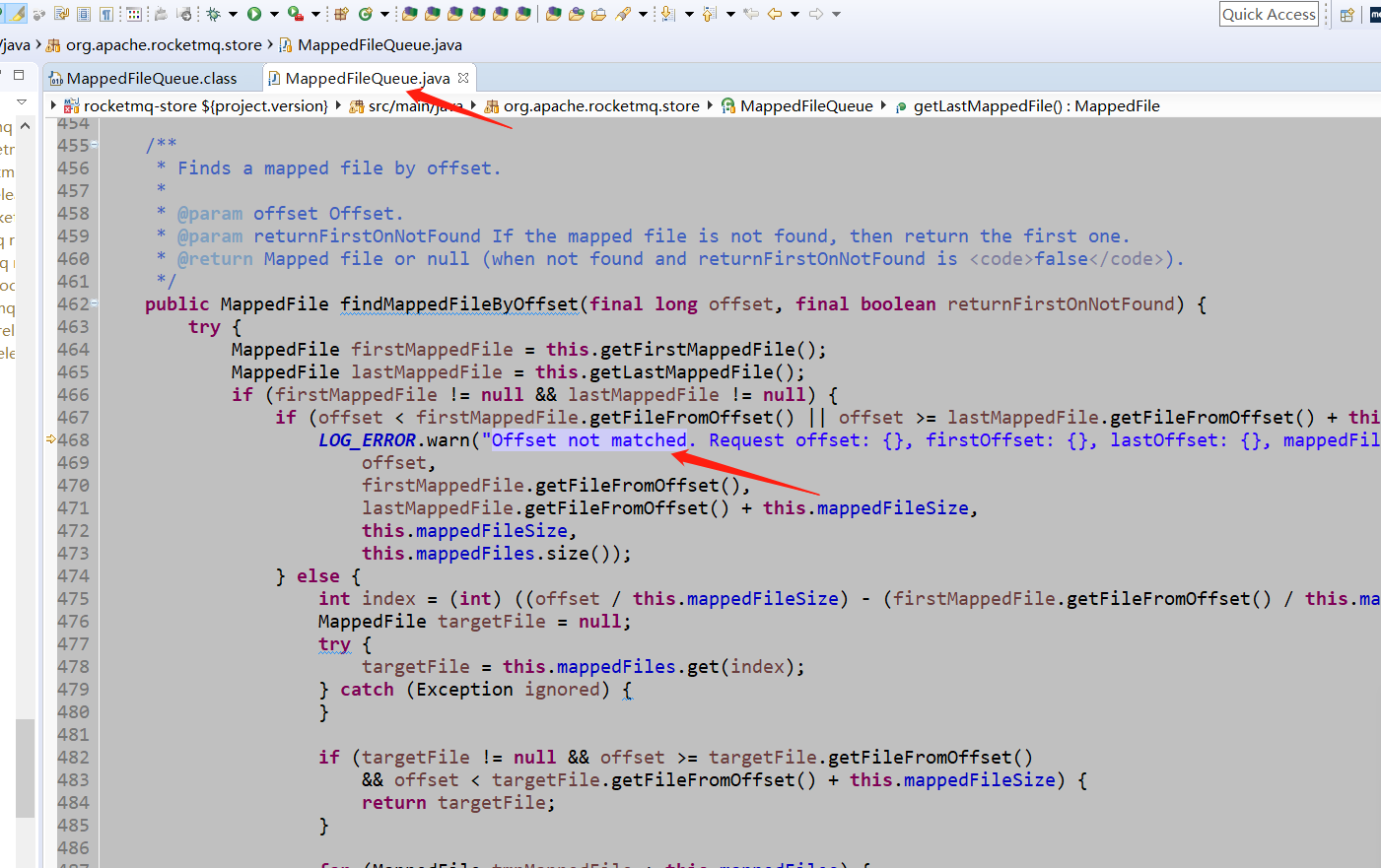 WARN FlushConsumeQueueService - Offset not matched. Request offset: 318000000, firstOffset: 312000000, lastOffset: 318000000, mappedFileSize: 6000000, mappedFiles count: 1 2021-01-26 02:53:24 WARN ScheduleMessageTimerThread - Offset not matched. Request offset: 17928800, firstOffset: 18000000, lastOffset: 24000000, mappedFileSize: 6000000, mappedFiles count: 1 2021-01-27 22:50:07 WARN AdminBrokerThread_11 - Offset not matched. Request offset: 0, firstOffset: 12000000, lastOffset: 18000000, mappedFileSize: 6000000, mappedFiles count: 1 我统计了一下,一共有三种  也看了下源码,大致的意思就是 当前的offset超出了最后一个mappedfile的最大偏移量,或者是比第一个mappedfile的最大偏移量还要小,也就是说如果比第一个文件的最大偏移量小的话,就说明已经在这个文件中被写过了,那么超出第二个文件的最大偏移量会怎么样呢?不知道我理解的对不对。 -- This is an automated message from the Apache Git Service. To respond to the message, please log on to GitHub and use the URL above to go to the specific comment. To unsubscribe, e-mail: [email protected] For queries about this service, please contact Infrastructure at: [email protected]