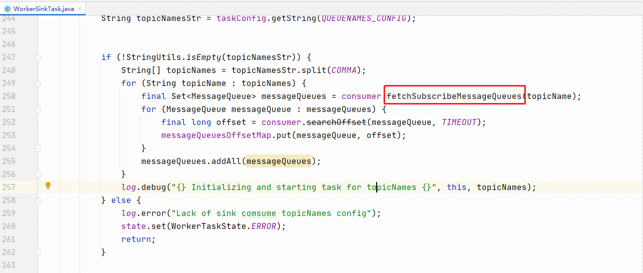 我看这个WorkerSinkTask.java只用到了fetchSubscribeMessageQueues,其它地方也没有看到fetchMessageQueuesInBalance,这个是怎么用做的负载均衡? -- This is an automated message from the Apache Git Service. To respond to the message, please log on to GitHub and use the URL above to go to the specific comment. To unsubscribe, e-mail: [email protected] For queries about this service, please contact Infrastructure at: [email protected]