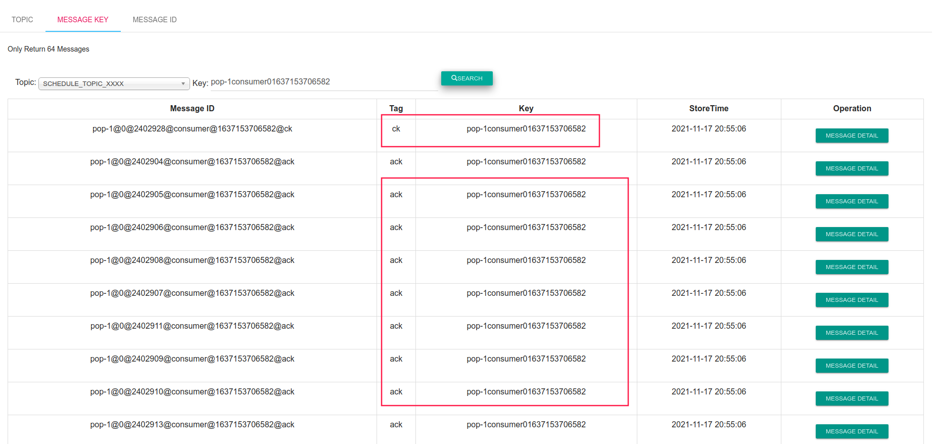 **FEATURE REQUEST** 1. Please describe the feature you are requesting. - It is difficult for us to determine whether the ck message of a batch of messages is acked. - We can add `Keys` for ck and ack msgs to associate them. - The format of keys is: `topic@group@queueId@popTime` 2. Provide any additional detail on your proposed use case for this feature. To determine whether this batch of messages has been acked. We can use console to query them by keys.  2. Indicate the importance of this issue to you (blocker, must-have, should-have, nice-to-have). Are you currently using any workarounds to address this issue? nice-to-have 4. If there are some sub-tasks using -[] for each subtask and create a corresponding issue to map to the sub task: -- This is an automated message from the Apache Git Service. To respond to the message, please log on to GitHub and use the URL above to go to the specific comment. To unsubscribe, e-mail: [email protected] For queries about this service, please contact Infrastructure at: [email protected]