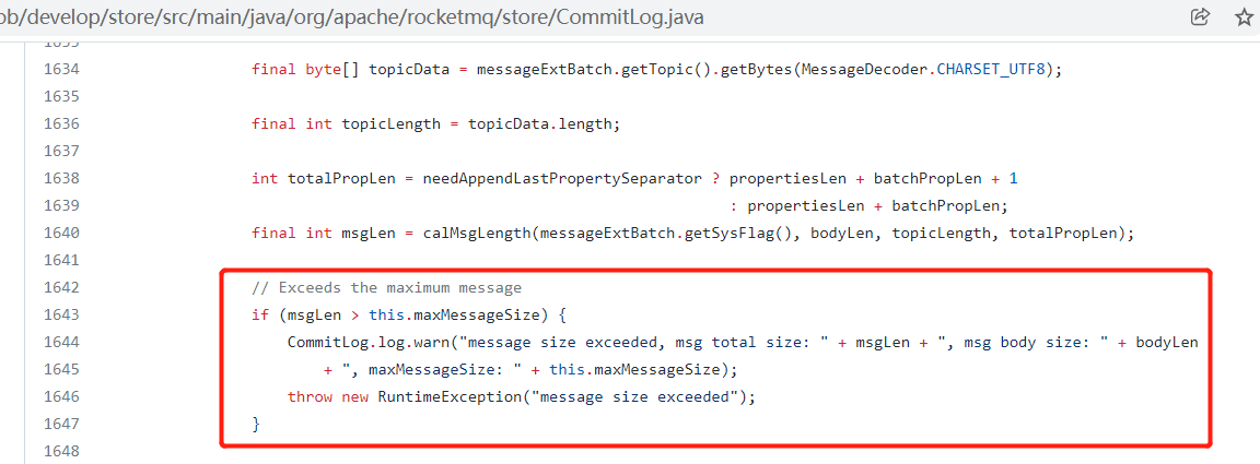 > Whether to add more information to the RuntimeException message, such as the current prop length, limit length... Thanks for your advice, I've corrected it. For commit in class `CommitLog`, in order to keep the **code style consistent**, the properties length limit is only recorded in the log, and the exception message is consistent with the code style below:  -- This is an automated message from the Apache Git Service. To respond to the message, please log on to GitHub and use the URL above to go to the specific comment. To unsubscribe, e-mail: [email protected] For queries about this service, please contact Infrastructure at: [email protected]