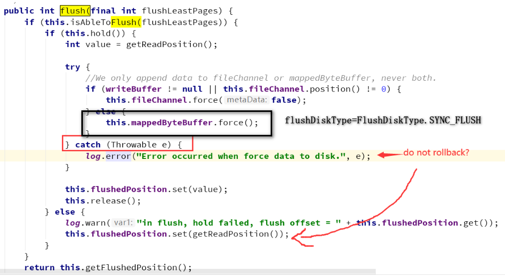 broker config : flushDiskType=FlushDiskType.SYNC_FLUSH,should user "this.mappedByteBuffer.force()"  MappedByteBuffer force():  -- This is an automated message from the Apache Git Service. To respond to the message, please log on to GitHub and use the URL above to go to the specific comment. To unsubscribe, e-mail: [email protected] For queries about this service, please contact Infrastructure at: [email protected]