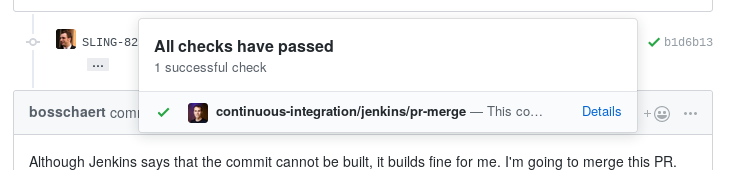 rombert commented on issue #22: SLING-8253 - Make the APIs JARs source collector able to checkout SCMs if -sources artifacts are not available URL: https://github.com/apache/sling-slingfeature-maven-plugin/pull/22#issuecomment-459487200 Also, for reference, click on the green checkmark or the red x near the commit and you will get a dialog with a "details" link  There you can see the full build results.