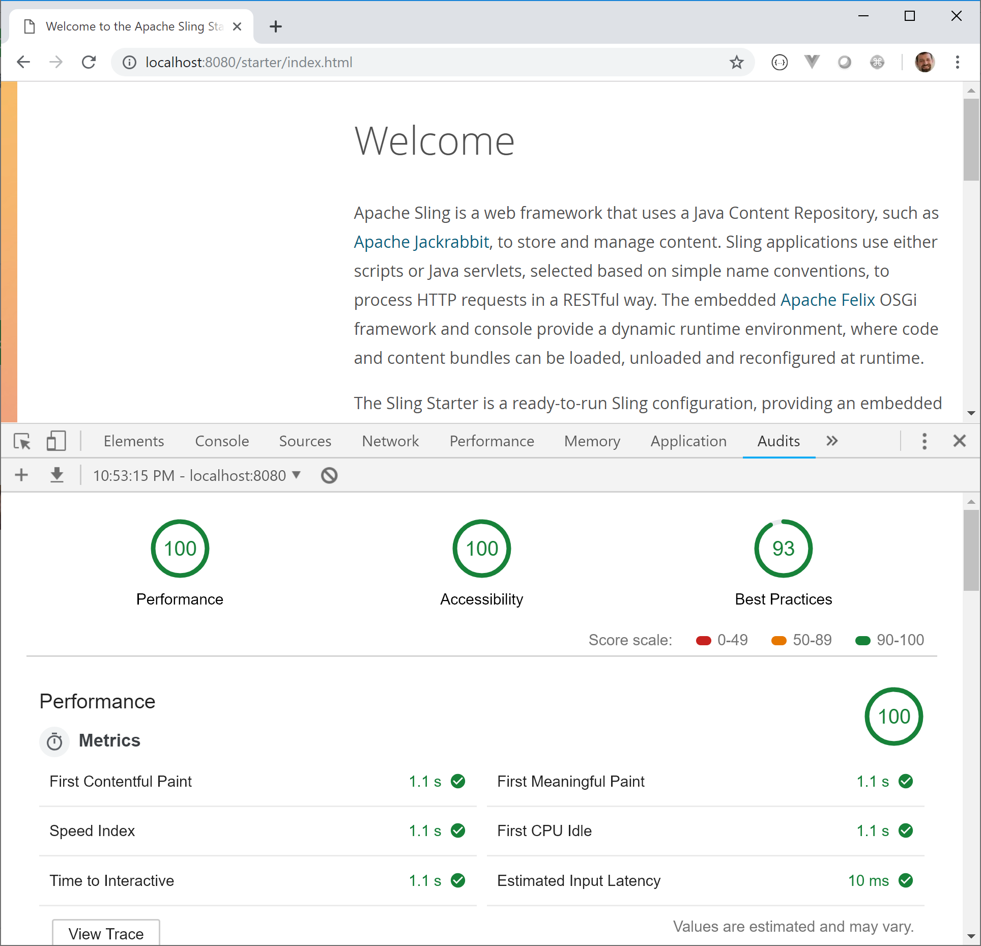 reusr1 commented on issue #1: SLING-8278 improve chrome audit score URL: https://github.com/apache/sling-org-apache-sling-starter-content/pull/1#issuecomment-470826401 > @reusr1 Like it! Can you commit the changes into the PR and I'll get this PR merged? @klcodanr @rombert made the change as requested. I also darkened the link color a bit to make it AAA compliant @rombert I switched the getSessionInfo over to the async method and also added an unknown state (initial state) to make it less 'flashy'. the only thing missing now is http/2 support to get to a perfect score