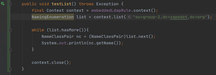 + NamingEnumeration list = context.list("ou=semi-people,dc=zapodot,dc=org");