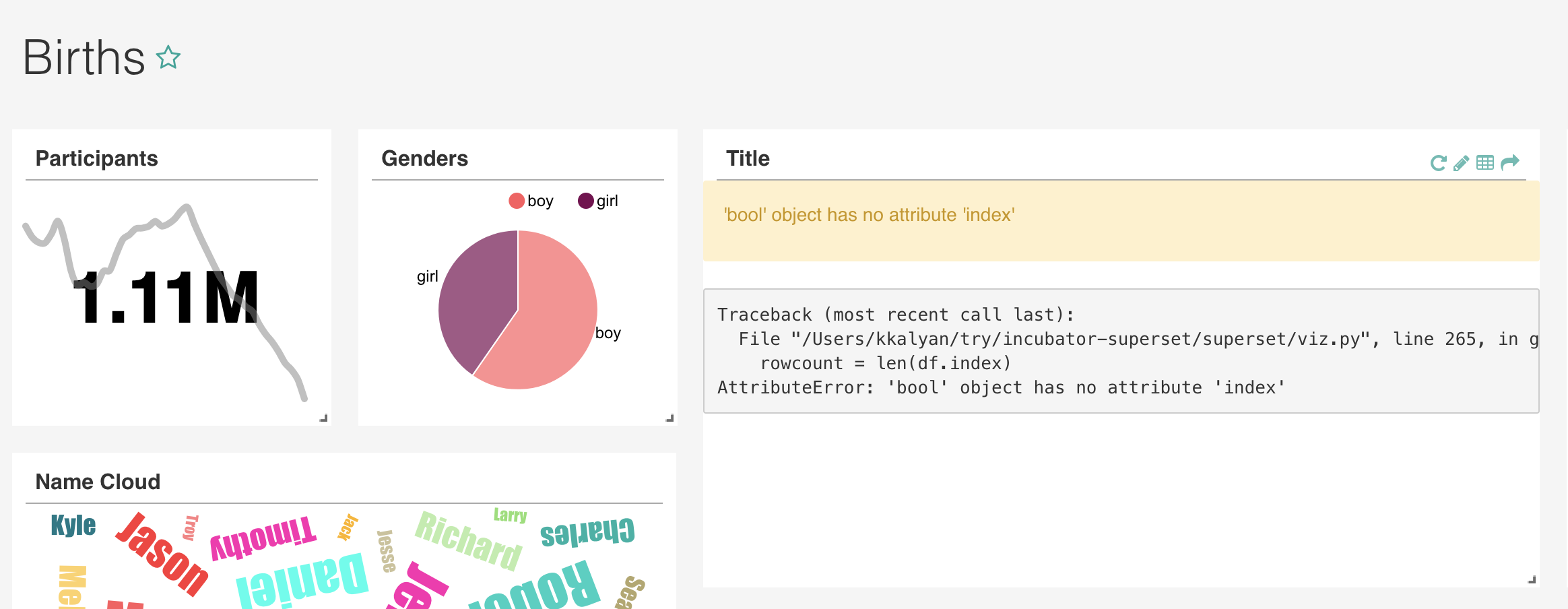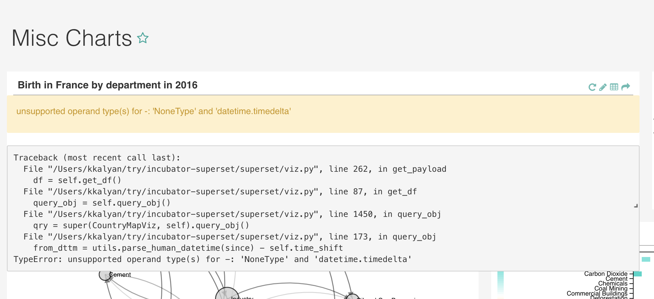 kkalyan opened a new issue #4081: Errors in Demo Dashboards URL: https://github.com/apache/incubator-superset/issues/4081 Make sure these boxes are checked before submitting your issue - thank you! - [x ] I have checked the superset logs for python stacktraces and included it here as text if any - [x] I have reproduced the issue with at least the latest released version of superset - [x] I have checked the issue tracker for the same issue and I haven't found one similar ### Superset version {"GIT_SHA": "1e79e9cd2a064c8a6daa77bb74e549e0b12cf840", "version": "0.23.0dev"} ### Expected results ### Actual results #### Births Dashboard  ``` Traceback (most recent call last): File "/Users/kkalyan/try/incubator-superset/superset/viz.py", line 265, in get_payload rowcount = len(df.index) AttributeError: 'bool' object has no attribute 'index' ``` #### Misc Charts  ``` Traceback (most recent call last): File "/Users/kkalyan/try/incubator-superset/superset/viz.py", line 262, in get_payload df = self.get_df() File "/Users/kkalyan/try/incubator-superset/superset/viz.py", line 87, in get_df query_obj = self.query_obj() File "/Users/kkalyan/try/incubator-superset/superset/viz.py", line 1450, in query_obj qry = super(CountryMapViz, self).query_obj() File "/Users/kkalyan/try/incubator-superset/superset/viz.py", line 173, in query_obj from_dttm = utils.parse_human_datetime(since) - self.time_shift TypeError: unsupported operand type(s) for -: 'NoneType' and 'datetime.timedelta' ``` ### Steps to reproduce superset load_examples