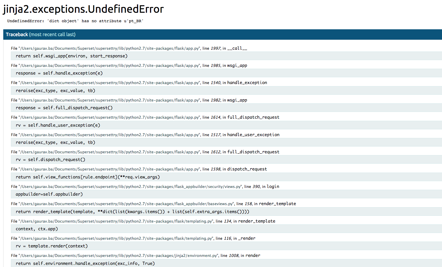 gauravbansal2000 opened a new issue #4865: Superset 'dict object' has no attribute u'pt_BR' URL: https://github.com/apache/incubator-superset/issues/4865 ### Superset version 0.22 ### Expected results Was expecting superset to open properly ### Actual results  ### Steps to reproduce Installed superset 0.22 according to instructions [https://github.com/apache/incubator-superset/blob/010a69de83273934cc02c4fcc9e6b3014591193e/CONTRIBUTING.md](url) npm run dev on superset/assets/ Did anyone face this issue before?