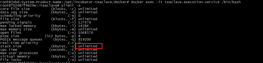 针对teaclave 是修改docker容器内(teaclave_execution_service)的ulimit吧? 我修改为-1  容器内的ulimit -a 对应的stack size已经是unlimited了