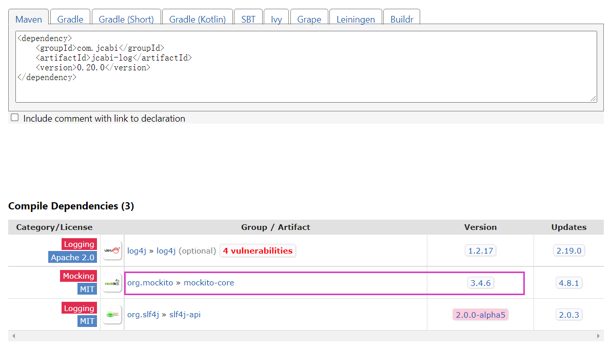 > jcabi-manifests --> jcabi-log --> mockito-core