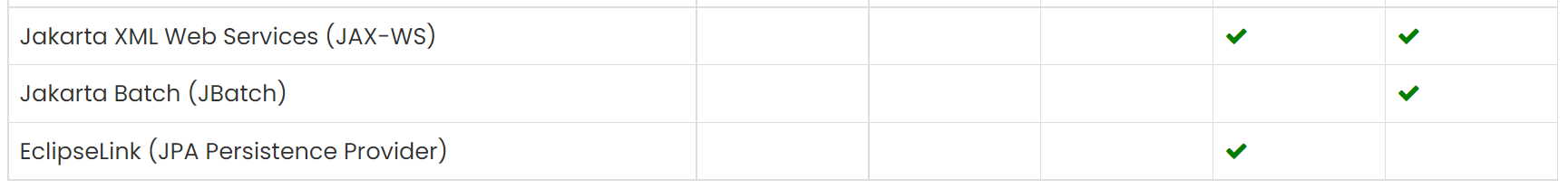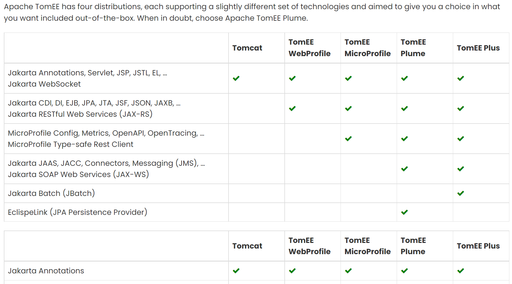 fixed consistence between "flavors comparison page in website" versus "actual jars being present in releases" question to reviewer : Is it intended to have Plus not containing Eclipselink while Plume not containing batchee in recent releases ? if not : need to update poms and postpone this PR. if yes : need to update website, proposed visual for fix (changed parts) below :   listening to your suggestions for the synthetic table (my students would appreciate this synthesis) https://issues.apache.org/jira/browse/TOMEE-3846 -- This is an automated message from the Apache Git Service. To respond to the message, please log on to GitHub and use the URL above to go to the specific comment. To unsubscribe, e-mail: [email protected] For queries about this service, please contact Infrastructure at: [email protected]