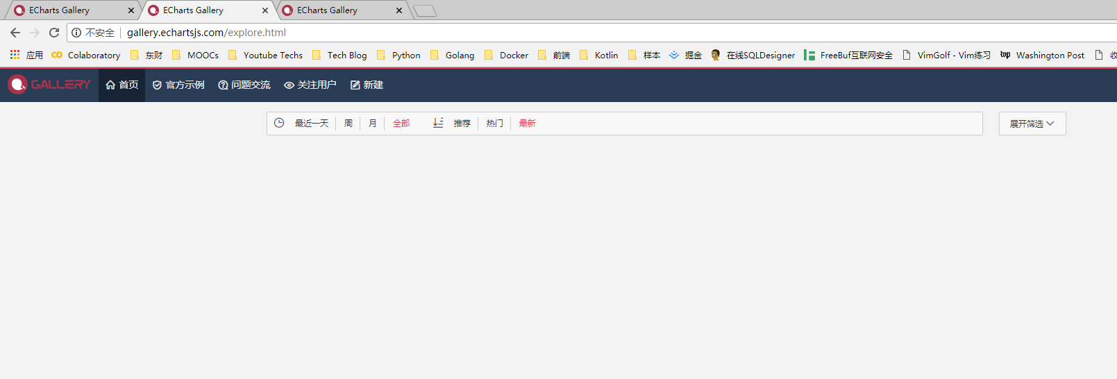 ### One-line summary [问题简述] [http://gallery.echartsjs.com](http://gallery.echartsjs.com) 打开无实例。 具体图表页面如 [http://gallery.echartsjs.com/editor.html?c=xryHrMdE2M](http://gallery.echartsjs.com/editor.html?c=xryHrMdE2M) 也无法打开。 主机在电信网上。 ### Version & Environment [版本及环境] + ECharts version [ECharts 版本]:/ + Browser version [浏览器类型和版本]: Chrome V67 + OS Version [操作系统类型和版本]: Win10 ### Expected behaviour [期望结果] 能正常访问gallery。 ### ECharts option [ECharts配置项] 不涉及option。 ### Other comments [其他信息] <!-- For example: Screenshot or Online demo --> <!-- [例如,截图或线上实例 (JSFiddle/JSBin/Codepen)] -->   [ Full content available at: https://github.com/apache/incubator-echarts/issues/8917 ] This message was relayed via gitbox.apache.org for [email protected]