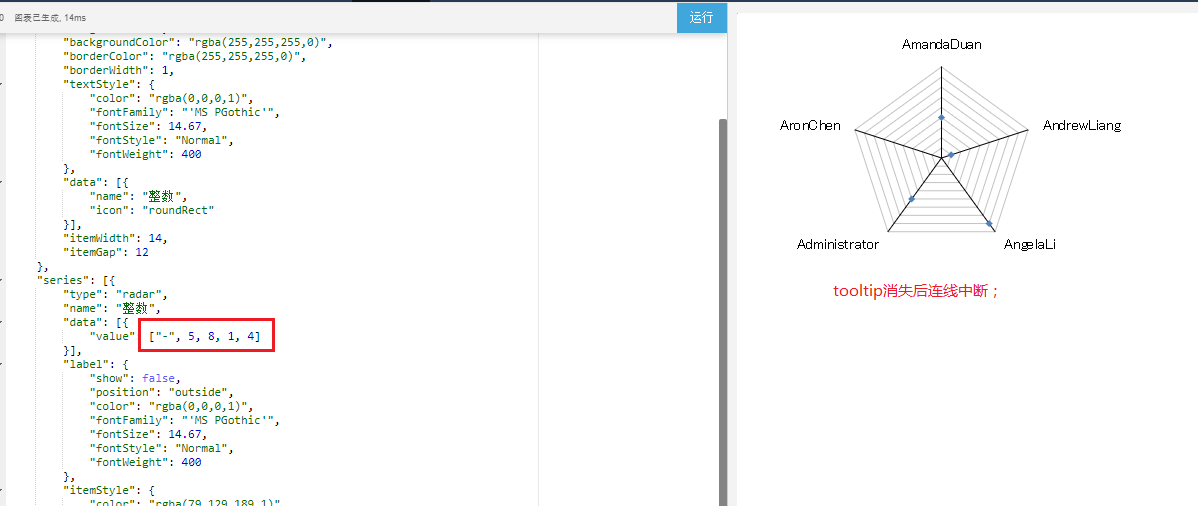 雷达图中的数据是 ["-", 5, 8, 1, 4],其中“-”处于第一位和中间位置时表现不一致,当“-”处于数组第一位时,tooltip消失后连线消失了。