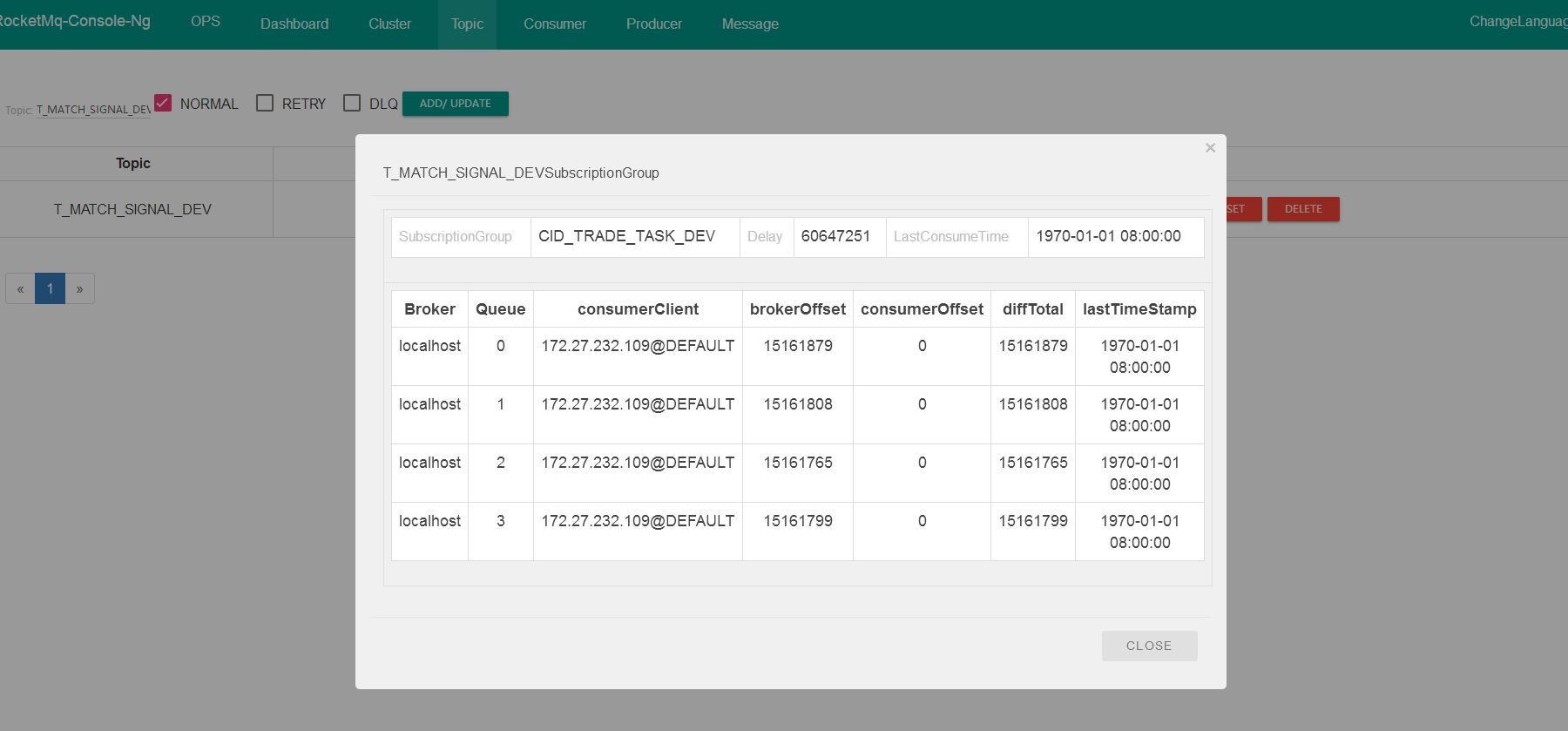 但是在rocketmq-console里显示消费点位(consumerOffset) 都是0,看起来像是全部堆积的样子