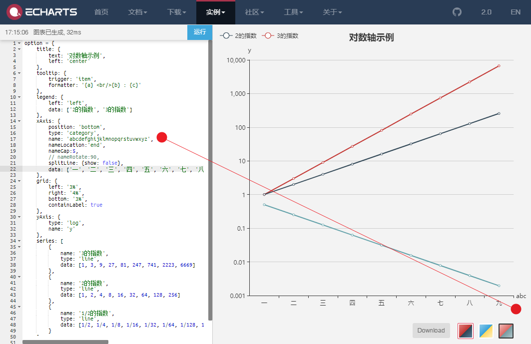 [online demo](http://echarts.baidu.com/examples/editor.html?c=line-log&qq-pf-to=pcqq.c2c) settings: ```json xAxis: { type: 'category', name: 'abcefghijklmnopqrstuvwxyz', nameLocation:'end', nameGap:5, // nameRotate:90, splitLine: {show: false}, data: ['一', '二', '三', '四', '五', '六', '七', '八', '九'] }, ``` [ Full content available at: https://github.com/apache/incubator-echarts/issues/9049 ] This message was relayed via gitbox.apache.org for [email protected]