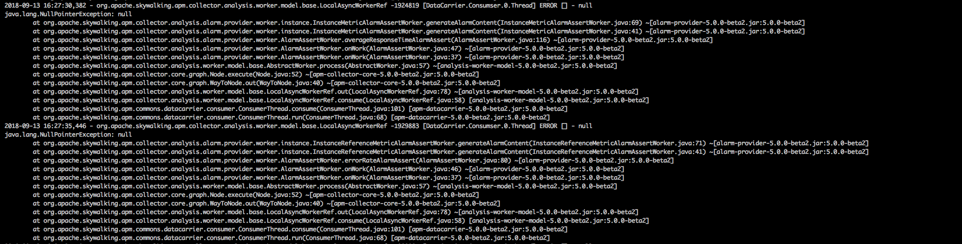 ___ ### Question - What do you want to know? What the reason about this exception and how to resolve ? ___ ### Bug - Which version of SkyWalking, OS and JRE? skywalking 5.0 os linux jre 1.8 - Which company or project? guazi.com maodou.com - What happen? If possible, provide a way for reproducing the error. e.g. demo application, component version. ___ ### Requirement or improvement - Please describe about your requirements or improvement suggestions.   [ Full content available at: https://github.com/apache/incubator-skywalking/issues/1670 ] This message was relayed via gitbox.apache.org for [email protected]