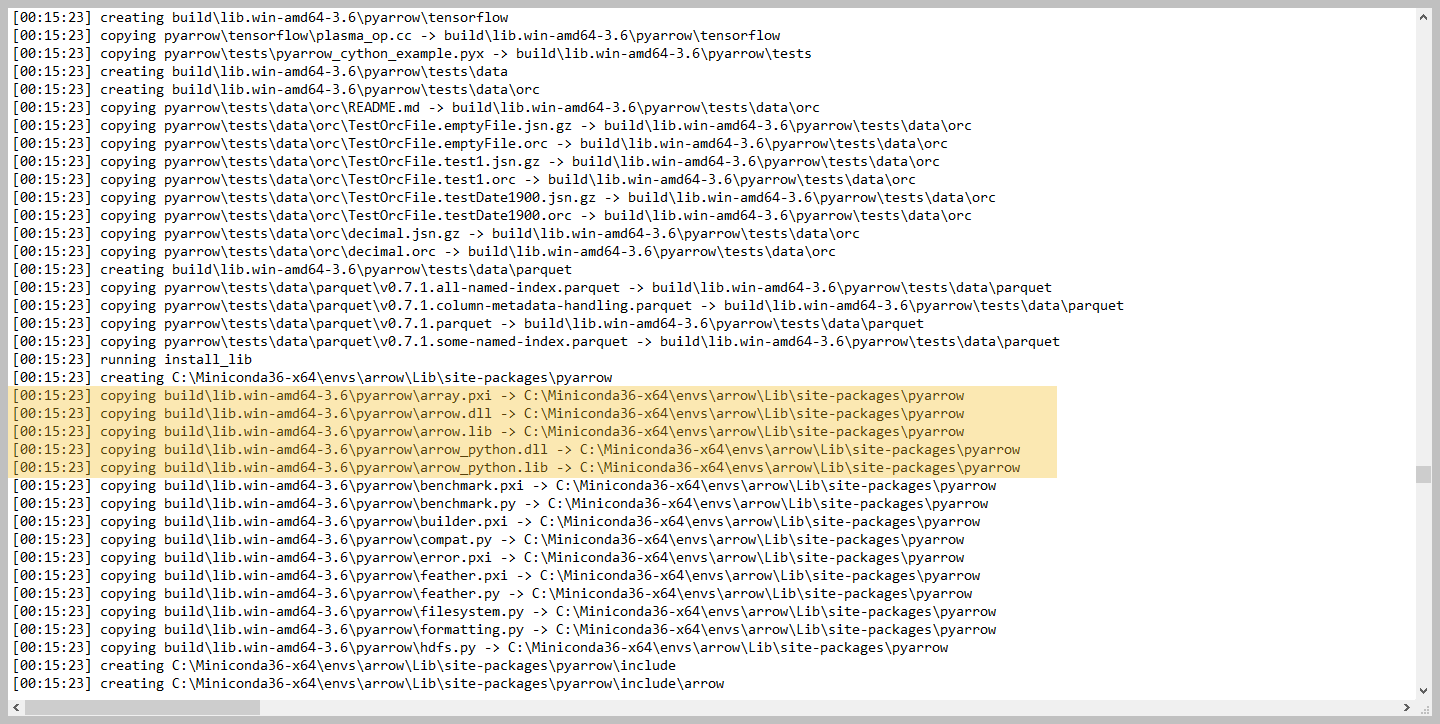 On AppVeyor's log I am seeing that the library files are being placed in `site-packages`.  But if I look at where they are installed locally(when installed from conda-forge), they are on the folder I coded for. [ Full content available at: https://github.com/apache/arrow/pull/2518 ] This message was relayed via gitbox.apache.org for [email protected]