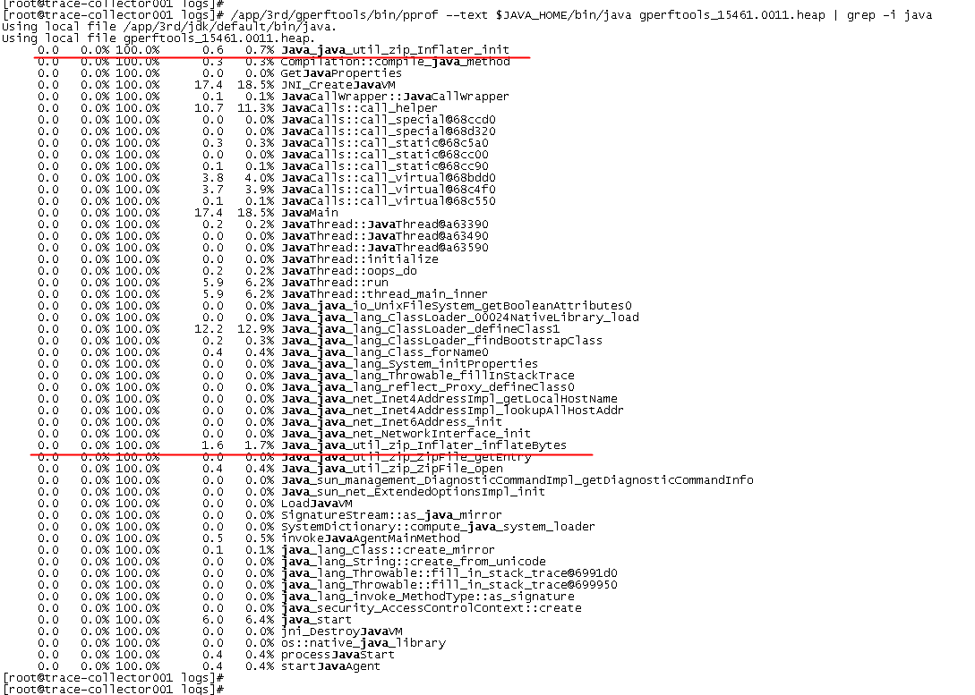 the result of gperftools with skywalking-agent-6.0.0-alpha:  the result of gperftools with skywalking-agent-3.2.6:  It seems the key is Java_java_util_zip_Inflater_init. The premise of two test is the same: export LD_PRELOAD=/app/3rd/gperftools/lib/libtcmalloc.so export HEAP_PROFILE_TIME_INTERVAL=10 And print heap per 10 seconds, and fetch eleventh heap as above. [ Full content available at: https://github.com/apache/incubator-skywalking/issues/1666 ] This message was relayed via gitbox.apache.org for [email protected]