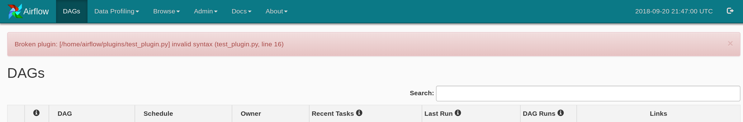 - [x] My PR addresses the following [Airflow Jira](https://issues.apache.org/jira/browse/AIRFLOW/) issues and references them in the PR title. For example, "\[AIRFLOW-XXX\] My Airflow PR" - https://issues.apache.org/jira/browse/AIRFLOW-2548 - In case you are fixing a typo in the documentation you can prepend your commit with \[AIRFLOW-XXX\], code changes always need a Jira issue. ### Description - [x] Here are some details about my PR, including screenshots of any UI changes:  This change displays an alert in the web interface for each ImportError that occurs on the DAGs homepage. A limitation is that the presence of the error alert reflects the brokenness of the plugin according to the webserver, not the scheduler. So, if the user fixes the plugin and restarts *only* the webserver, that web UI will not show the error anymore, but the airflow DAGs may still be broken because the scheduler also needs a restart. In other words, the plugin can be simultaneously fixed for the webserver but broken for the scheduler. After editing the plugin's code, both the scheduler and the webserver need to be restarted. The proposer of the Jira issue @andscoop outlined a different approach to add this feature in the Jira issue. I may be mistaken, but that approach would cause the opposite limitation, where the error alert would reflect the brokenness of the plugin according to the scheduler, not the webserver? ### Tests - [x] My PR adds the following unit tests __OR__ does not need testing for this extremely good reason: It is unclear how I can unit test a small UI change like this. ### Commits - [x] My commits all reference Jira issues in their subject lines, and I have squashed multiple commits if they address the same issue. In addition, my commits follow the guidelines from "[How to write a good git commit message](http://chris.beams.io/posts/git-commit/)": 1. Subject is separated from body by a blank line 1. Subject is limited to 50 characters (not including Jira issue reference) 1. Subject does not end with a period 1. Subject uses the imperative mood ("add", not "adding") 1. Body wraps at 72 characters 1. Body explains "what" and "why", not "how" ### Documentation - [x] In case of new functionality, my PR adds documentation that describes how to use it. - When adding new operators/hooks/sensors, the autoclass documentation generation needs to be added. Added a sentence to clarify the need to restart both the webserver and the scheduler after plugin changes. ### Code Quality - [x] Passes `git diff upstream/master -u -- "*.py" | flake8 --diff` [ Full content available at: https://github.com/apache/incubator-airflow/pull/3930 ] This message was relayed via gitbox.apache.org for [email protected]