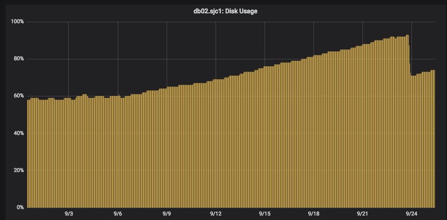 Our DB disk before the upgrade was hovering just below 60%. You can see the daily compaction (we have compaction restricted to off hours) take the disk space down a bit every day as it goes up. then on the night of September 6th we deployed CouchDB 2.2 and compaction just kinda stops happening. Disk space usage grew at a fairly steady pace and our alerts triggered at 85%. After a bunch of reviewing our configs, testing different configs, we were unable to get auto compaction to work. On the 23rd we ran a script that grabbed every DB, compared the disk size to data size, and then we manually compacted (using the _compact endpoint) the worst 1k DBs. This gave us back about 22% of our disk, but is not a long term solution. On one of our other DB servers that sees a lot of activity the _global_changes DB grew to about 85 GB in size. We manually triggered the compaction and it compacted down to 1 GB. We have been playing with a bunch of different values to see if something else works, but here are some of our current config settings: ``` [compaction_daemon] check_interval = 3600 min_file_size = 131072 (most our DBs are 500 MB in size) [compactions] _default = [{db_fragmentation, "40%"}, {view_fragmentation, "30%"}, {from, "03:00"}, {to, "09:00"}] ``` We did confirm CouchDB is reading the compactions settings correctly and that the compaction daemon is running. We do configure CouchDB to store all data on the /srv mount, but there are no symlinks. If there is any other information you need or that we can provide let us know. :) [ Full content available at: https://github.com/apache/couchdb/issues/1579 ] This message was relayed via gitbox.apache.org for [email protected]