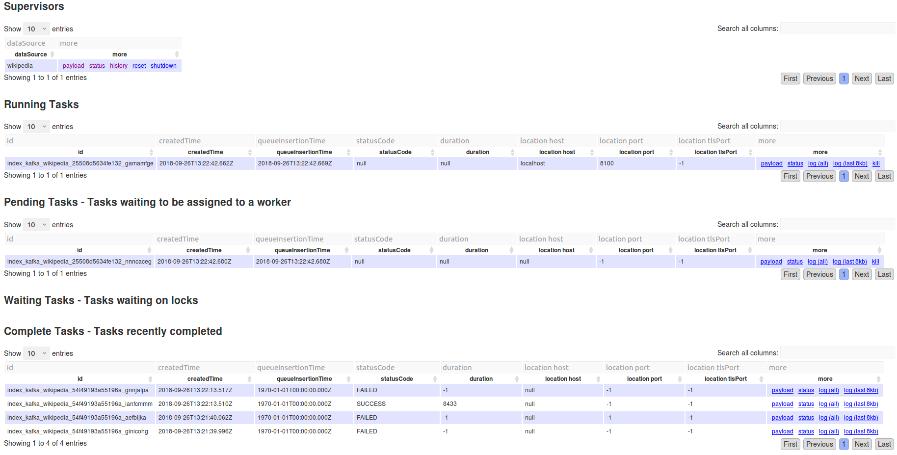 Now after I've restarted everything and create the topic again (wikipedia), as soon as i `POST` the supervisor i get this  for further clarification note that i haven't yet issued the command which ultimately refers to the json file (`./bin/kafka-console-producer.sh --broker-list localhost:9092 --topic wikipedia < {PATH_TO_DRUID}/quickstart/wikiticker-2015-09-12-sampled.json`) I also tried reseting the supervisor, shutting it down etc, but i can't find a way to actually stop this from happening. Overlord log as soon as I've POSTed the supervisor: ``` 2018-09-26T13:33:25,996 INFO [Curator-PathChildrenCache-0] io.druid.indexing.overlord.RemoteTaskRunner - Worker[localhost:8091] reportin' for duty! 2018-09-26T13:34:10,667 INFO [MonitorScheduler-0] io.druid.java.util.emitter.core.LoggingEmitter - Event [{"feed":"metrics","timestamp":"2018-09-26T13:34:10.636Z","service":"druid/overlord","host":"localhost:8090","version":"0.12.3","metric":"jvm/mem/max","value":256901120,"memKind":"heap"}] 2018-09-26T13:34:10,668 INFO [MonitorScheduler-0] io.druid.java.util.emitter.core.LoggingEmitter - Event [{"feed":"metrics","timestamp":"2018-09-26T13:34:10.667Z","service":"druid/overlord","host":"localhost:8090","version":"0.12.3","metric":"jvm/mem/committed","value":256901120,"memKind":"heap"}] 2018-09-26T13:34:10,668 INFO [MonitorScheduler-0] io.druid.java.util.emitter.core.LoggingEmitter - Event [{"feed":"metrics","timestamp":"2018-09-26T13:34:10.668Z","service":"druid/overlord","host":"localhost:8090","version":"0.12.3","metric":"jvm/mem/used","value":52502344,"memKind":"heap"}] 2018-09-26T13:34:10,669 INFO [MonitorScheduler-0] io.druid.java.util.emitter.core.LoggingEmitter - Event [{"feed":"metrics","timestamp":"2018-09-26T13:34:10.668Z","service":"druid/overlord","host":"localhost:8090","version":"0.12.3","metric":"jvm/mem/init","value":268435456,"memKind":"heap"}] 2018-09-26T13:34:10,669 INFO [MonitorScheduler-0] io.druid.java.util.emitter.core.LoggingEmitter - Event [{"feed":"metrics","timestamp":"2018-09-26T13:34:10.669Z","service":"druid/overlord","host":"localhost:8090","version":"0.12.3","metric":"jvm/mem/max","value":-1,"memKind":"nonheap"}] 2018-09-26T13:34:10,670 INFO [MonitorScheduler-0] io.druid.java.util.emitter.core.LoggingEmitter - Event [{"feed":"metrics","timestamp":"2018-09-26T13:34:10.669Z","service":"druid/overlord","host":"localhost:8090","version":"0.12.3","metric":"jvm/mem/committed","value":65404928,"memKind":"nonheap"}] 2018-09-26T13:34:10,670 INFO [MonitorScheduler-0] io.druid.java.util.emitter.core.LoggingEmitter - Event [{"feed":"metrics","timestamp":"2018-09-26T13:34:10.670Z","service":"druid/overlord","host":"localhost:8090","version":"0.12.3","metric":"jvm/mem/used","value":63287368,"memKind":"nonheap"}] 2018-09-26T13:34:10,670 INFO [MonitorScheduler-0] io.druid.java.util.emitter.core.LoggingEmitter - Event [{"feed":"metrics","timestamp":"2018-09-26T13:34:10.670Z","service":"druid/overlord","host":"localhost:8090","version":"0.12.3","metric":"jvm/mem/init","value":2555904,"memKind":"nonheap"}] 2018-09-26T13:34:10,671 INFO [MonitorScheduler-0] io.druid.java.util.emitter.core.LoggingEmitter - Event [{"feed":"metrics","timestamp":"2018-09-26T13:34:10.671Z","service":"druid/overlord","host":"localhost:8090","version":"0.12.3","metric":"jvm/pool/max","value":251658240,"poolKind":"nonheap","poolName":"Code Cache"}] 2018-09-26T13:34:10,671 INFO [MonitorScheduler-0] io.druid.java.util.emitter.core.LoggingEmitter - Event [{"feed":"metrics","timestamp":"2018-09-26T13:34:10.671Z","service":"druid/overlord","host":"localhost:8090","version":"0.12.3","metric":"jvm/pool/committed","value":11403264,"poolKind":"nonheap","poolName":"Code Cache"}] 2018-09-26T13:34:10,672 INFO [MonitorScheduler-0] io.druid.java.util.emitter.core.LoggingEmitter - Event [{"feed":"metrics","timestamp":"2018-09-26T13:34:10.671Z","service":"druid/overlord","host":"localhost:8090","version":"0.12.3","metric":"jvm/pool/used","value":10628672,"poolKind":"nonheap","poolName":"Code Cache"}] 2018-09-26T13:34:10,672 INFO [MonitorScheduler-0] io.druid.java.util.emitter.core.LoggingEmitter - Event [{"feed":"metrics","timestamp":"2018-09-26T13:34:10.672Z","service":"druid/overlord","host":"localhost:8090","version":"0.12.3","metric":"jvm/pool/init","value":2555904,"poolKind":"nonheap","poolName":"Code Cache"}] 2018-09-26T13:34:10,672 INFO [MonitorScheduler-0] io.druid.java.util.emitter.core.LoggingEmitter - Event [{"feed":"metrics","timestamp":"2018-09-26T13:34:10.672Z","service":"druid/overlord","host":"localhost:8090","version":"0.12.3","metric":"jvm/pool/max","value":-1,"poolKind":"nonheap","poolName":"Metaspace"}] 2018-09-26T13:34:10,673 INFO [MonitorScheduler-0] io.druid.java.util.emitter.core.LoggingEmitter - Event [{"feed":"metrics","timestamp":"2018-09-26T13:34:10.672Z","service":"druid/overlord","host":"localhost:8090","version":"0.12.3","metric":"jvm/pool/committed","value":47710208,"poolKind":"nonheap","poolName":"Metaspace"}] 2018-09-26T13:34:10,673 INFO [MonitorScheduler-0] io.druid.java.util.emitter.core.LoggingEmitter - Event [{"feed":"metrics","timestamp":"2018-09-26T13:34:10.673Z","service":"druid/overlord","host":"localhost:8090","version":"0.12.3","metric":"jvm/pool/used","value":46695080,"poolKind":"nonheap","poolName":"Metaspace"}] 2018-09-26T13:34:10,674 INFO [MonitorScheduler-0] io.druid.java.util.emitter.core.LoggingEmitter - Event [{"feed":"metrics","timestamp":"2018-09-26T13:34:10.673Z","service":"druid/overlord","host":"localhost:8090","version":"0.12.3","metric":"jvm/pool/init","value":0,"poolKind":"nonheap","poolName":"Metaspace"}] 2018-09-26T13:34:10,674 INFO [MonitorScheduler-0] io.druid.java.util.emitter.core.LoggingEmitter - Event [{"feed":"metrics","timestamp":"2018-09-26T13:34:10.674Z","service":"druid/overlord","host":"localhost:8090","version":"0.12.3","metric":"jvm/pool/max","value":1073741824,"poolKind":"nonheap","poolName":"Compressed Class Space"}] 2018-09-26T13:34:10,674 INFO [Mon