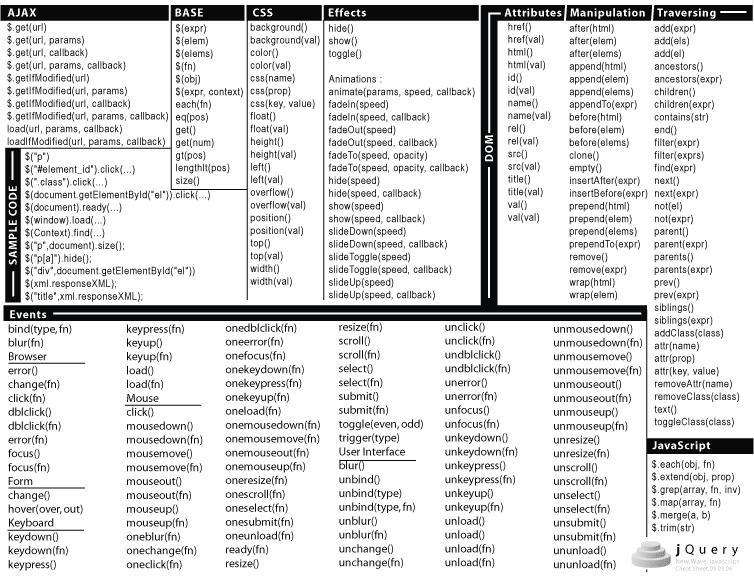 PDF http://www.define-web.com/jquery_cheat_sheet/jquery_cheat_sheet_080306_v1.pdf http://www.define-web.com/jquery_cheat_sheet/jquery_cheat_sheet_080306_v1_pg2.pdf PNG http://www.define-web.com/jquery_cheat_sheet/jquery_cheat_sheet_080306_v1.png http://www.define-web.com/jquery_cheat_sheet/jquery_cheat_sheet_080306_v1_pg2.png Karl Swedberg-2 wrote: > > On Oct 9, 2006, at 6:18 AM, Dan Atkinson wrote: > >> FYI: Every single one of those links leads to a 'forbidden' page. >> >> Karl Swedberg-2 wrote: >>> >>> On Oct 6, 2006, at 11:41 PM, Rey Bango wrote: >>>> I recall a JQuery cheat sheet floating around. Anyone have the link >>>> to that? >>> >>> Hi Rey, >>> >>> They came from Nilesh Patel. >>> >>> PDF >>> http://www.define-web.com/jquery_cheat_sheet/ >>> jquery_cheat_sheet_080306_v1.pdf >>> http://www.define-web.com/jquery_cheat_sheet/ >>> jquery_cheat_sheet_080306_v1_pg2.pdf >>> >>> PNG >>> http://www.define-web.com/jquery_cheat_sheet/ >>> jquery_cheat_sheet_080306_v1.png >>> http://www.define-web.com/jquery_cheat_sheet/ >>> jquery_cheat_sheet_080306_v1_pg2.png > > Dan, sorry about that. Actually, they work fine if you stitch the > first and second lines or the third and fourth lines together (for > PDF and for PNG). Looks like my mail client (Apple Mail) chopped the > URLs in half, and I'm not sure how to fix that in the Preferences. > > Karl > ___________________ > Karl Swedberg > www.englishrules.com > www.learningjquery.com > > > > _______________________________________________ > jQuery mailing list > [email protected] > http://jquery.com/discuss/ > > -- View this message in context: http://www.nabble.com/Cheat-Sheet--tf2399270.html#a6717090 Sent from the JQuery mailing list archive at Nabble.com. _______________________________________________ jQuery mailing list [email protected] http://jquery.com/discuss/