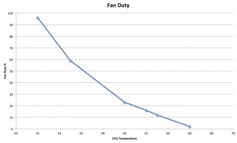 chill wrote: > I updated my fan control script to keep a log of the amount of time that > the fan is 'on', and then went a bit nerdy (nerdier?), and worked out > the duty cycle for several different set temperatures. So on a hot > summer's day, inside a hot amplifier, my RPi4 4GB running LMS and > Squeezelite sits naturally at about 67 to 68 degrees. My little fan > running off 3.3V can pull it down to about 52 degrees > > [image: > http://www.cjh.me.uk/MyPhotobucket/cache/DIYHifi/Fan%20Duty_480.jpg] > > So on the basis that 68 degrees is still some way short of the 80 > degrees that causes throttling, and is therefore considered safe (?) by > the manufacturers, that's where I've set my fan control. This means > that it's not being triggered under normal conditions, but if the load > on the Pi increases then it kicks in.
