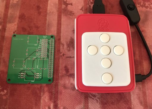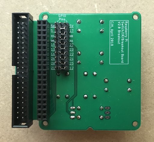 I made a second iteration. I learned the benefits of having a ground plane (or two!) for signal routing, and I improved the layout so that its easier to connect switches to GPIO pins without soldering. The middle column is the switch pins, the right hand column is some commonly unused GPIO pins, and the left column is some alternatives in case some of the pins in the right column are taken by other devices. So every switch pin has a choice of two GPIO pins that can be connected via jumpers alone, but if a different configuration is needed then jumper leads might be needed. The two alternative arrangements of legs on the IR receiver can also be accommodated by the third and fourth rows of pins.