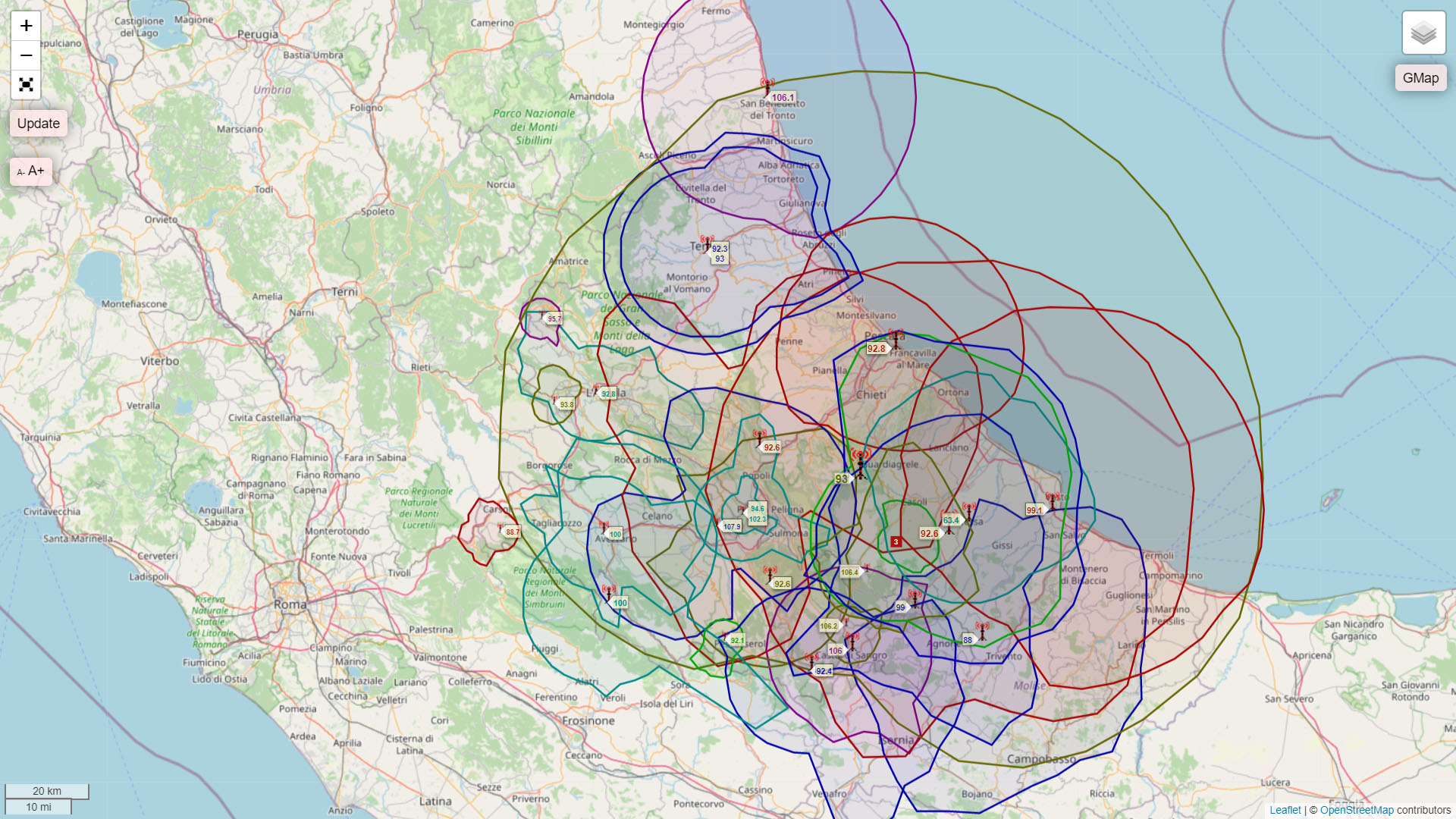 Italiassa (Abruzzo). Tässä kuvassa näiden lähettimien coveraget
